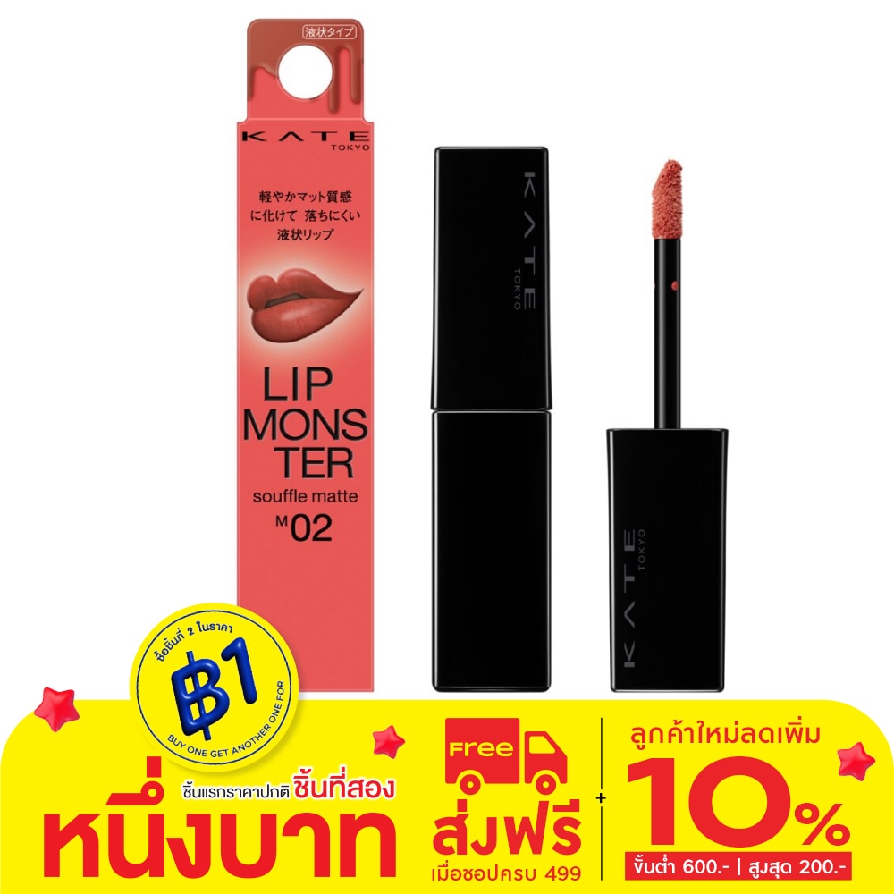 KATE LIP MONSTER SOUFFLE MATTE M02 (Immortal Cherry Blossom) 7 g. The new monster is fluffy and matte. Vivid colors. Long lasting. Souffle Matte finish, debut. Vivid coloration. Long lasting. Mask proof. A just- applied fresh look that lasts for many hours. From the long lasting lipstick series LIP MONSTER comes a new souffle type lipstick with fluffy and matte finish. Product features. A vivid coloration souffle formula that creates a long lasting soft finish. An airy soft matte finish that blurs the outline of the lips. Retains the existing functions of KATE LIP MONSTER :A just applied fresh look that lasts for many hours, Does not easily transfer even under a face mask, Dose not easily transfer to glass after drinking.