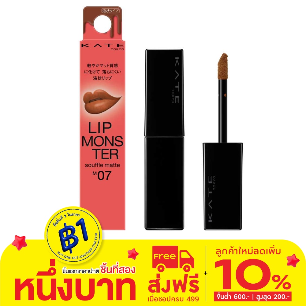 Kate Monster Souffle Lip Matte M07 (Burned Toast's Fate) 7 g. The monster is fluffy and matte. A just- applied fresh look that lasts for many hours. From the long-lasting lipstick series LIP MONSTER comes a souffle type lipstick with fluffy and matte finish. does not easily transfer even under a face mask, Dose not easily transfer to glass after drinking. Resistant to dryness. Product features. A vivid coloration souffle formula that creates a long-lasting soft finish. An airy soft matte finish that blurs the outline of the lips. Retains the existing functions of KATE LIP MONSTER: A just-applied fresh look that lasts for many hours, does not easily transfer even under a face mask, Dose not easily transfer to glass after drinking