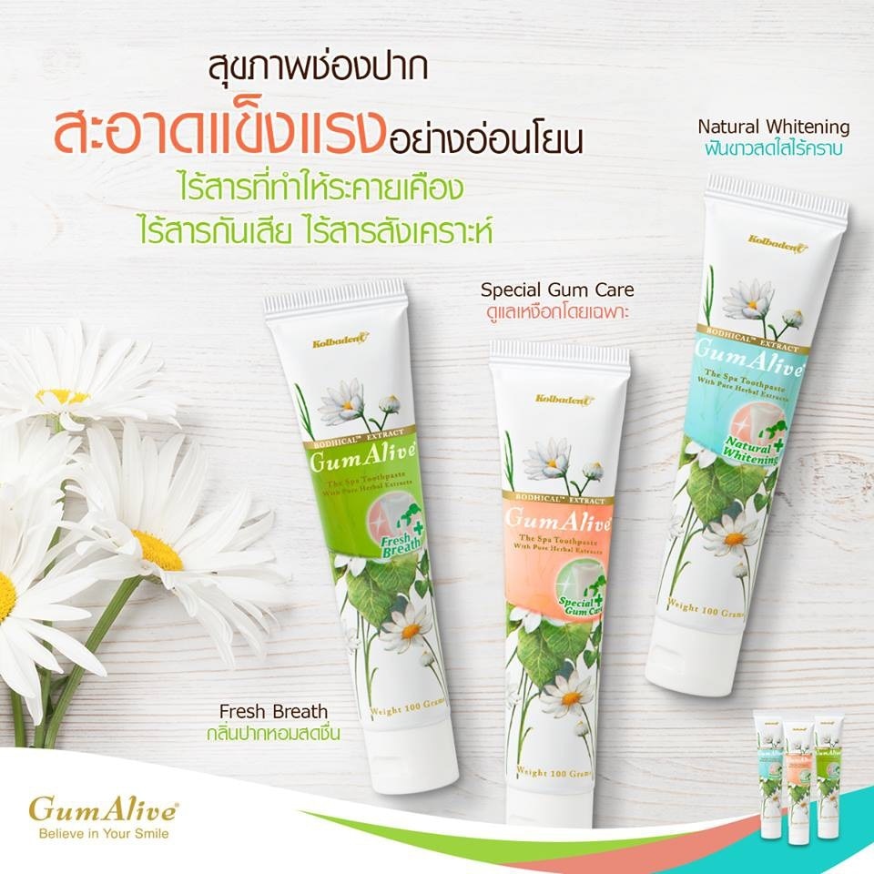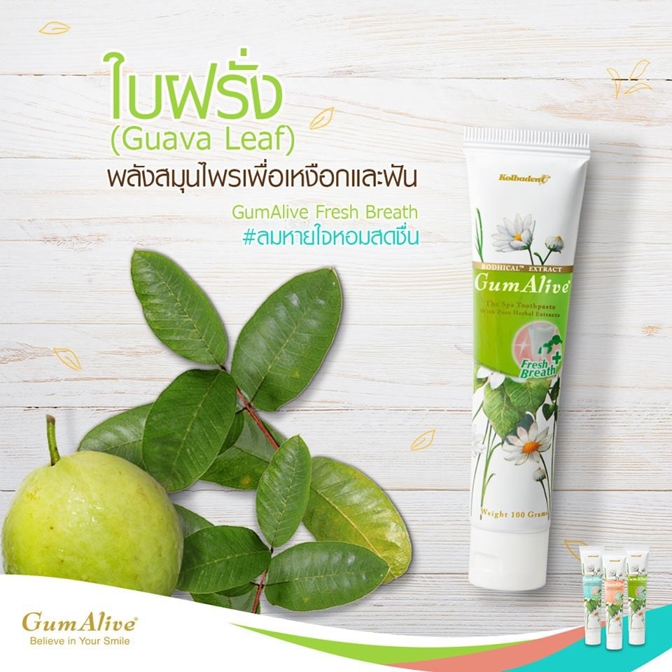 Kolbadent Gum Alive Fresh Breath Toothpaste 100 G. Combine the value of oil extracted from guava leaves Which has the ability to effectively inhibit bacteria which causes bad breath Also have Distilled Wood Vinegar Recognized for its wide range of benefits, including good natural deodorizing properties, Gum Alive Fresh Breath helps reduce bad breath effectively, helping to create clean, fresh, long-lasting breath, helping to reduce hot problems. In the oral cavity, it is suitable for people who relax less stressed, tired and have bad breath.