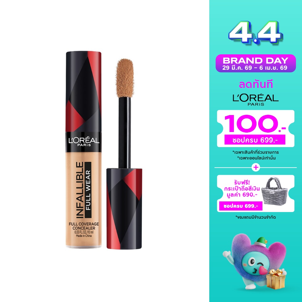 L'Oreal paris infallible full wear full coverage concealer be unstoppable experience full-on coverage and full-face wear for up to 24 hours. New full wear concealer is our highest coverage formula in our widest concealer shade range ever. L'Oreal paris full wear concealer provides full coverage with a flawless matte finish. This multi-use formula conceals imperfections while doubling as a contour/highlight product. Shape your face by going 1-2 shades deeper to contour and 1-2 shades lighter to highlighter and brighten. Our extra large applicator provides maximum coverage in one stroke to cover under-eye circles, acne scars, and discoloration. Our waterproof, non-greasy formula won't transfer, fade, or flake so your full coverage look is locked in all day.