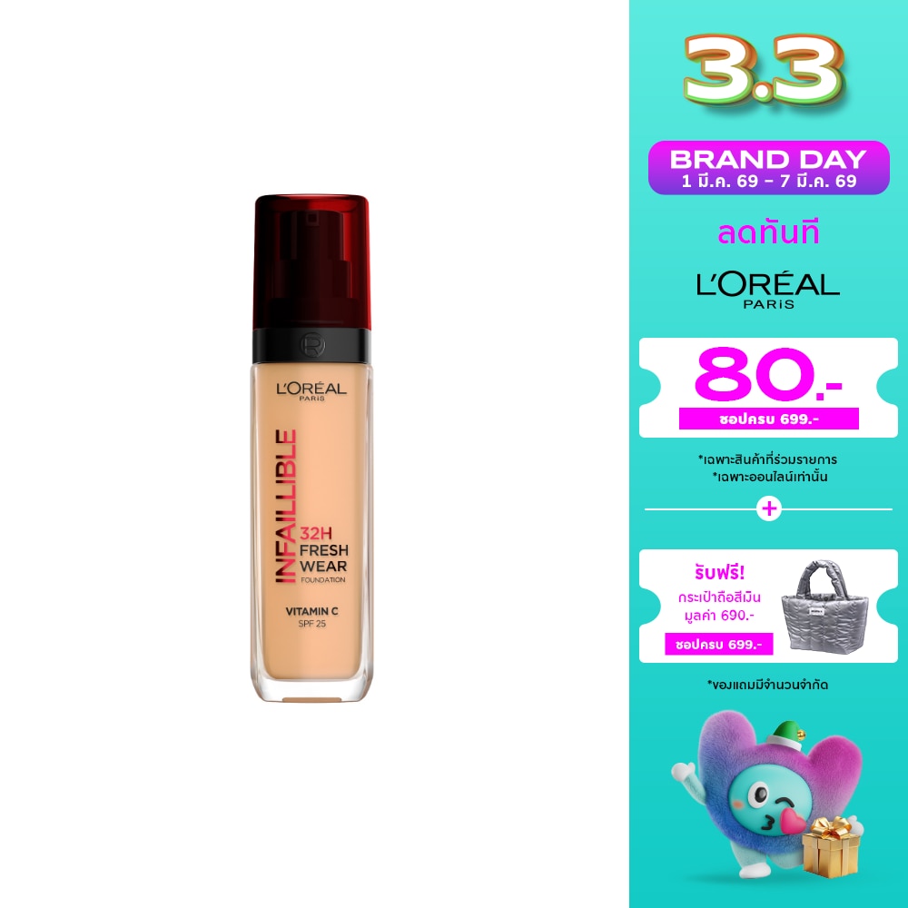 LOreal Paris Infaillible Fresh Wear Foundation 32H Longwear, water-proof, sweat-proof, lightweight on the skin, brighter and smoother skin in 4 weeks usage powered by vitamin c.-SPF 25-Tested Under Dermatologist Control-Non-Comedogenic-Suitable for all skin types- Foundation Available in 12 Shades Satisfaction results based on 172 volunteers after using the product by IMASENS, USA, June 2021. Satisfaction results based on 169 volunteers after using the product by IMASENS, United States, June 2021
