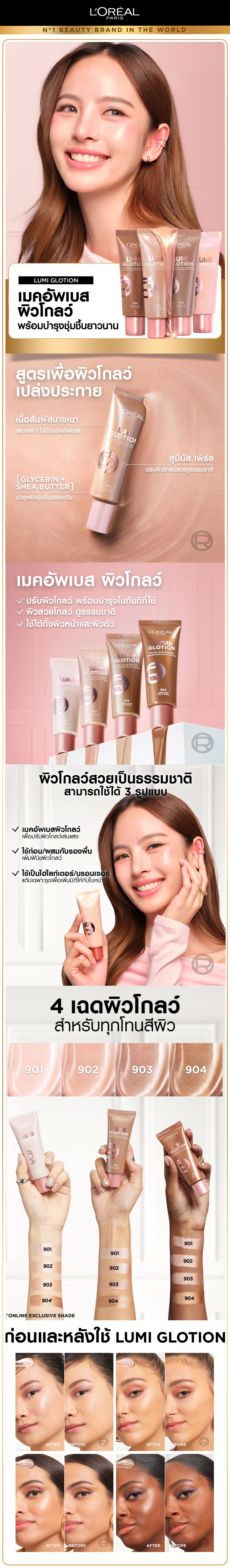 L'Oreal Paris Lumi Glory Primer 40 ml. Glow Boosting Makeup Base Makeup base for glowing skin with long-lasting moisture all day long. Can be used in 3 ways: Use before applying makeup to boost the glow of the skin. Use after applying makeup to highlight specific areas. Use makeup for a natural glow. There are 3 shades that can be used as a primer, highlighter, and bronzer: 901 Fair Glow, 902 Light Glow, 903 Medium Glow, Natural Glow Enhancer. Lightweight texture, dermatologist-tested for safety. Instantly moisturizes and radiates for a healthy, radiant glow all over the skin.