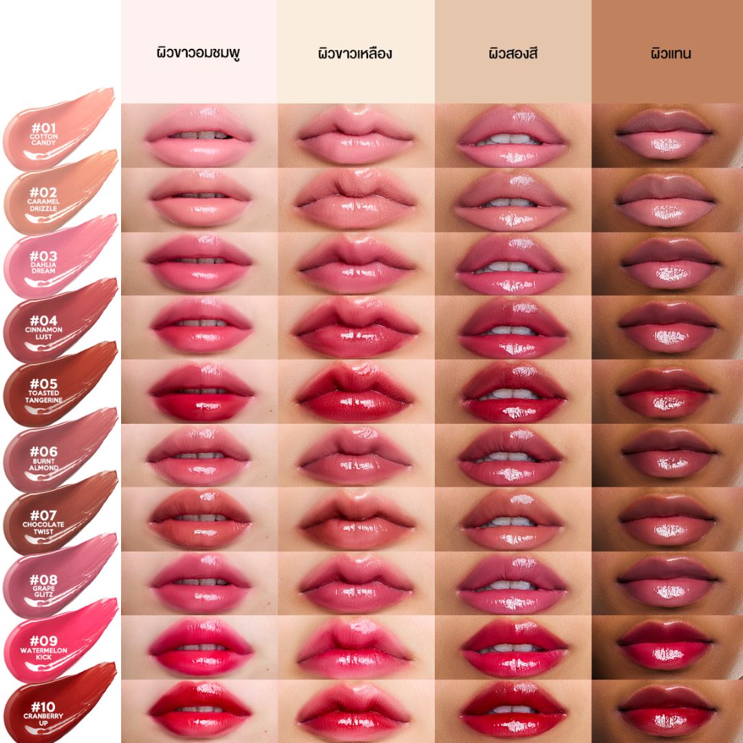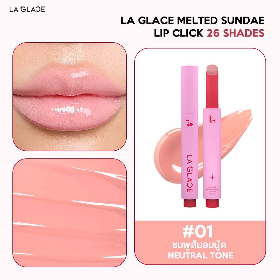 La Glace Melted Sundae Lip Click Forget your lip gloss and try La Glace Melted Sundae Lip Click An easy click and swipe lush lip balm that helps moisturizes and smooths the lips Get that lush lips like no other with La Glace s Melted Sundae 10 New Lip Click shades 01 Cotton Candy 02 Caramel Drizzle 03 Dahlia Dream 04Cinnamon Lust 05 Toasted Tangerine 06 Burnt Almond 07 Chocolate Twist 08 Grape Glitz 09 Watermelon Kick 10 Cranberry up Price 199 THB size 2 gram and How to use lip click 1 Click until the product appears 2Apply on lips to get a juicy and lush effect