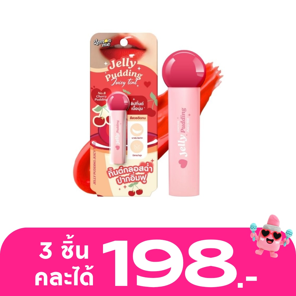 Lemon Me Jelly Pudding Juicy Tint No. 8 Cherry Pudding Lip Tint Glossy gloss, full lips, size 2.3 grams, cute stick shape, used for decorating lips, making the lips beautiful and attractive, giving a beautiful, juicy color. And with nourishing ingredients from camelina oil and 5 other extracts and vitamin E, it helps nourish the lips to be smooth, not dry, light on the lips, revealing beautiful, bright, plump lips, beautiful, full lips all day long. With the bright colors of the juicy lip tint And cute packaging Including the affordable price It is a trendy lip, never out of date And suitable to collect every color