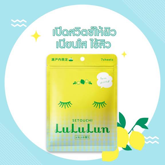 Face Mask Lemon Lululun L : Revitalizing the skin with extracted vitamin C from famous lemon producing yard of Japan Setoda which helps to reduce dark spots and skin blemishes and to reveal healthy bright skin. Also, mild acidity extracted from lemon with extract Locorice root can reduce skin redness from acne and reduce oil skin that causes comedones. The combined Mama Tabi extract can also enhance better skin hydrating ability