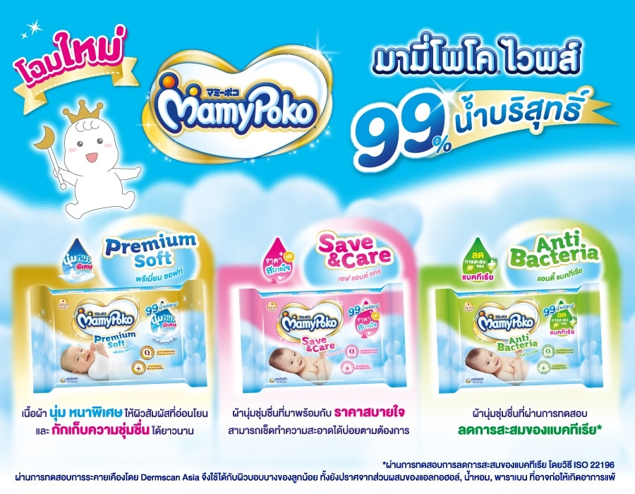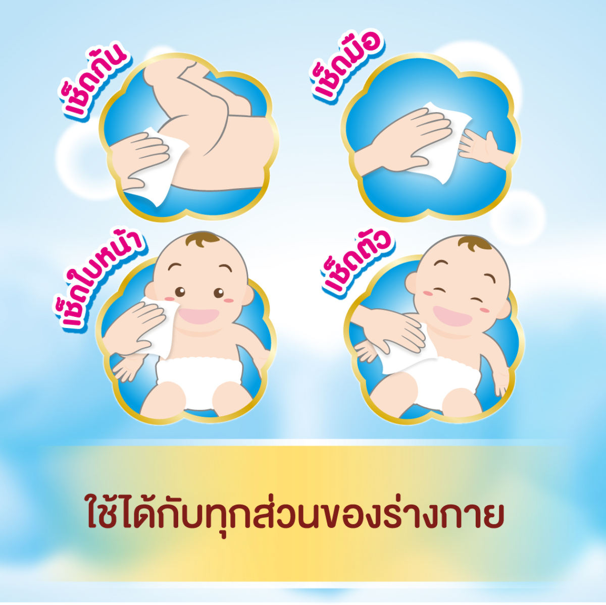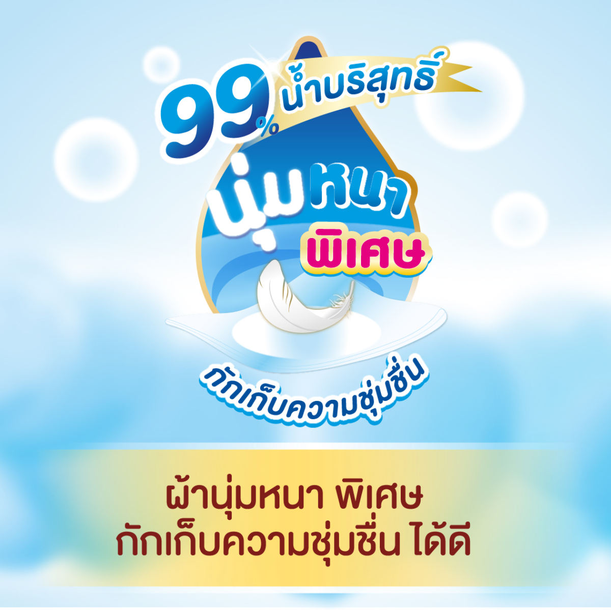 Mamypoko Soft Moist Bum Wipes made with Purified Water 99% and have thick, soft fabric that can make a baby's skin thoroughly, even sensitive skin. Without alcoholic, color, lotions and perfumes which may irritate baby's skin. Use clean as often as needed.