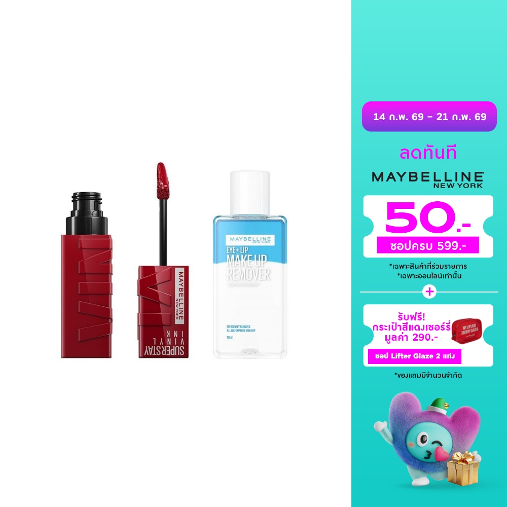 Meet Super Stay Vinyl Ink Longwear Liquid Lipcolor  for budge-resistant vinyl color and up to 16 hour wear. This longwear lipstick s Color Lock formula defies smudging and transfer and provides an instant shine finish. Shake before applying on clean, dry lips. For a world without animal testing. We do not test on animals. we practice effective, alternative testing methods to ensure product safety. Vegan Formula this comfortable lips for an instant shine in a vegan formula. Available in 8 shades.SUPER STAY VINYL INK LIQUID LIPCOLOR No-budge Vinyl Color. Up to 16HR wear. Make up remover that gently removes waterproof mascara, eye and lip makeup instantly .  Maybelline Eye & Lip Makeup Remover breaks down the most stubborn long-lasting makeup. Lids and lashes are remarkably clean, with no greasy residue. Gentle formula specifically formulated for sensitive eyes and the delicate skin around the eye area  No harsh rubbing needed  Beautifully clean with no greasy residue Bi-phase technology breaks up long wear and waterproof makeup  Easily removes eye and lip makeup