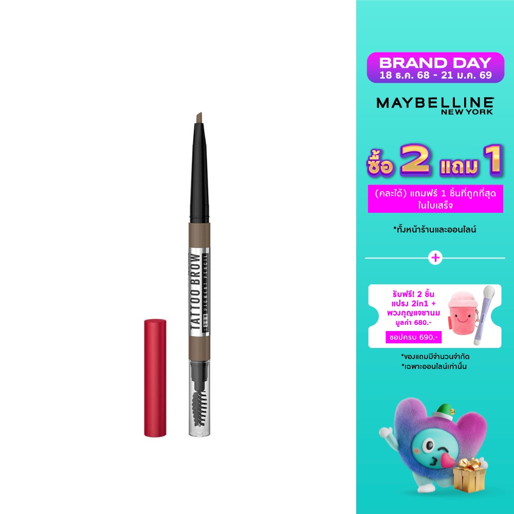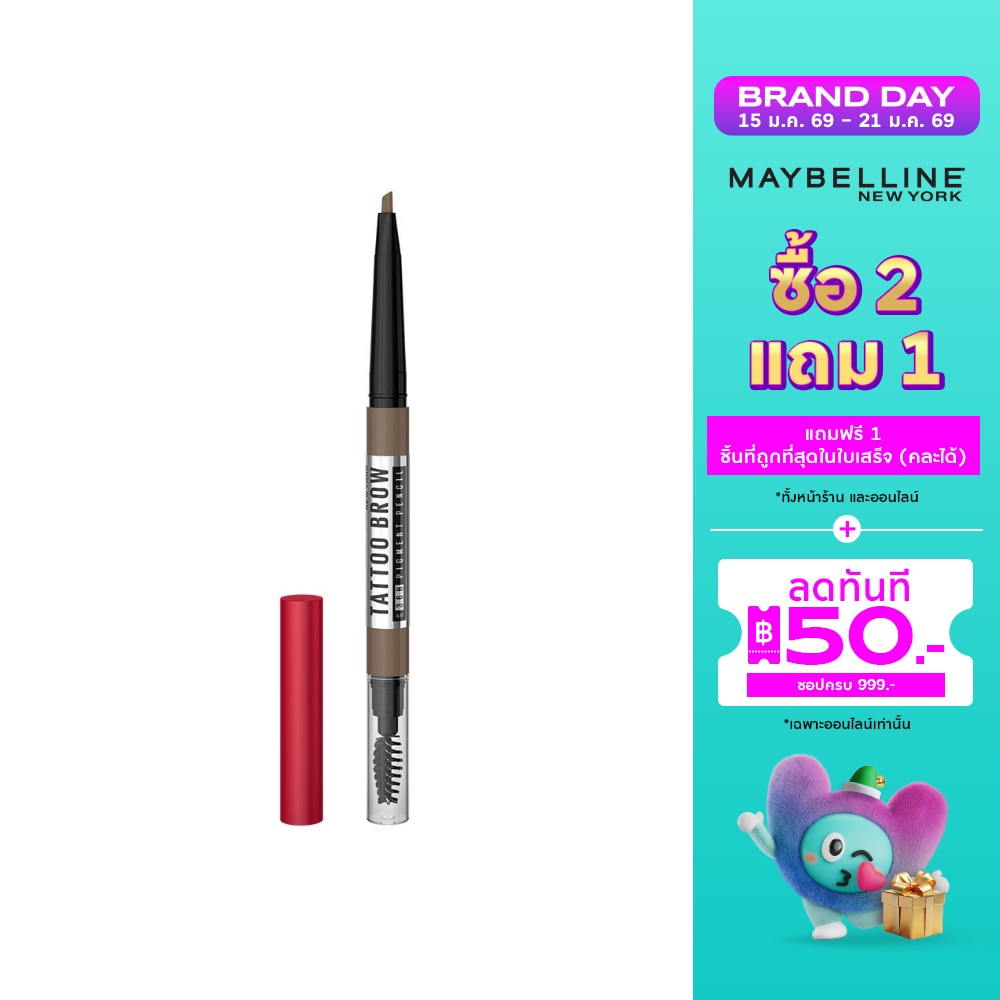 Meet maybelline new york tattoo brow 36H pencil for fast, easy, natural looking brows that last. This 36H pigment pencil is waterproof, sweatproof, and smudge resistant. This easy to use pencil draws on smoothly to define, fill, and shape brows. pigmented formula + all day wear, without smudging and fading throughout the day. available in 2 shades, grey brown and natural brown, suitable for asian skin and hair colors. tattoo brow 36H comes with a spoolie eyebrow brush on one end for defined, blended, natural-looking brows.