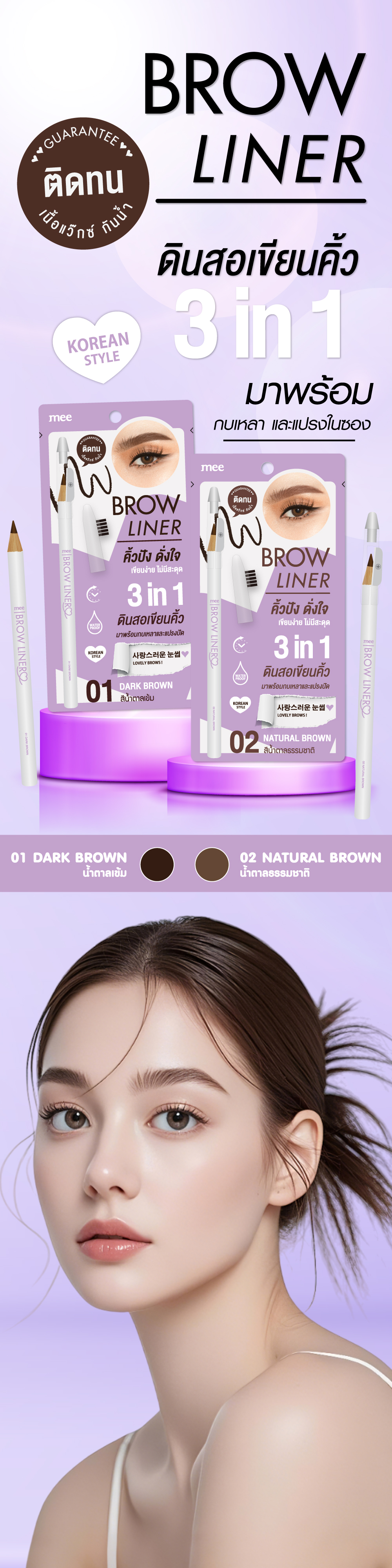 To create your ultimate brows with Mee Brow Liner. A pencil makes it very easy to draw and shape. It gives you a very sharp eyebrow look. Waterproof, sweatproof and long-lasting all day. A soft wax-based wooden eyebrow pencil that's easy to use and provides a clear brow outline. Comes with a sharpener and an eyebrow brush. Draws eyebrows in a beautiful line at the beginning and defines the end of the eyebrows. Beautiful and complete in one pencil. Waterproof, sweatproof, and long-lasting all day long.