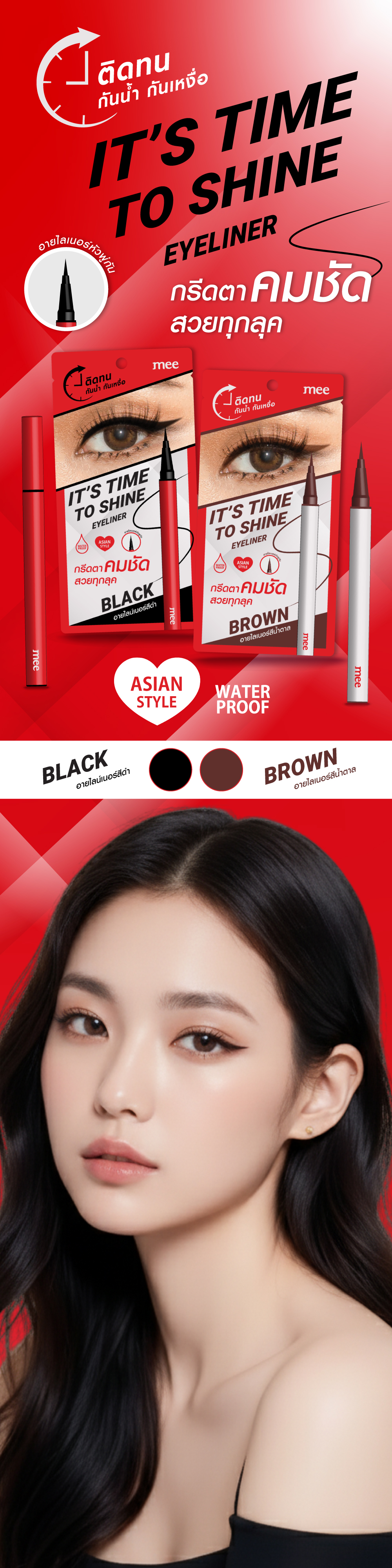 Mee It'S Time To Shine Eyeliner Brown 0.7g. A new innovation automatic liquid eyeliner. The slim brush can make a very slim and sharp line. Dry quickly. Color intense emphasis to your eyes to make your eyes look gorgeous and fabulous. Removed easily with make up remover. Waterproof, smudgeproof and long-lasting for 24 hours. HOW TO : For a subtle defining line, lightly draw the brush tip across the base of your lash line from the inner to the outer corner, pressing the brush as close to the lash roots as possible.