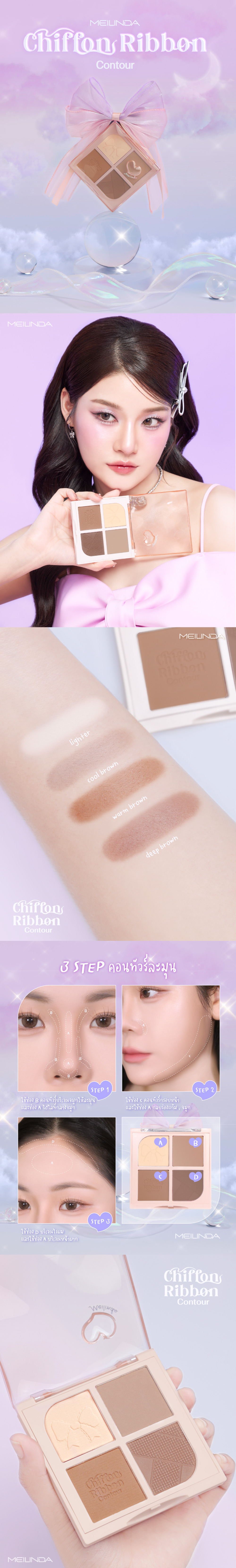 MEILINDA Chiffon Ribbon Contour, a contour palette with a clear and fine texture that helps add light and shadow to the face, giving it dimension. It adjusts the face to look slimmer and longer-lasting. It adheres well to the skin. The texture is soft and smooth, smooth on the skin, easy to blend, and gives a natural finish that lasts all day. It makes your skin look healthy. It also helps to adjust the face to be slimmer, sharper, and makes the skin look radiant and fresh. It can increase the level of lightness and darkness. The texture is soft and smooth. It is used for decorating the face to add dimension. It is easy to blend, giving a smooth film that blends with the skin. The color is bright and long-lasting. It fits the skin lightly. The pigments are clear, matching every skin tone, every style, and the skin looks healthy like a Korean girl every day. It gives a natural look. It is easy to carry and compact. It is used for decorating the face to add dimension. Recommendations When finished using, close the lid tightly and store at room temperature.