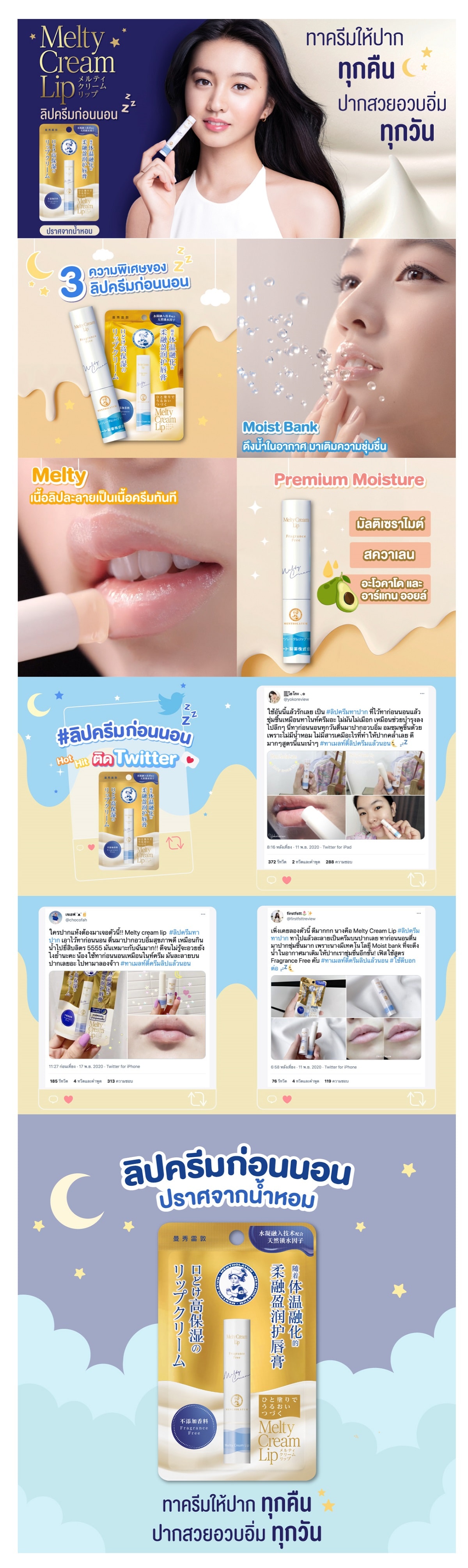 Sleeping Lip Balm-Fragrance Free for bed time with creamy lip texture can melt and blend into lips for deep nourishing. It reacts to water in the air and hold moisture in. Lips will get smoother and fuller in the morning.