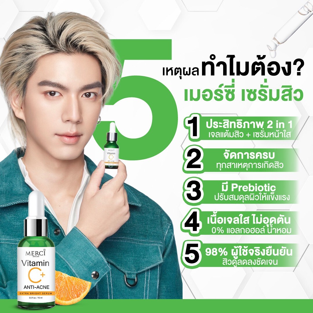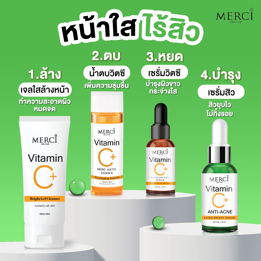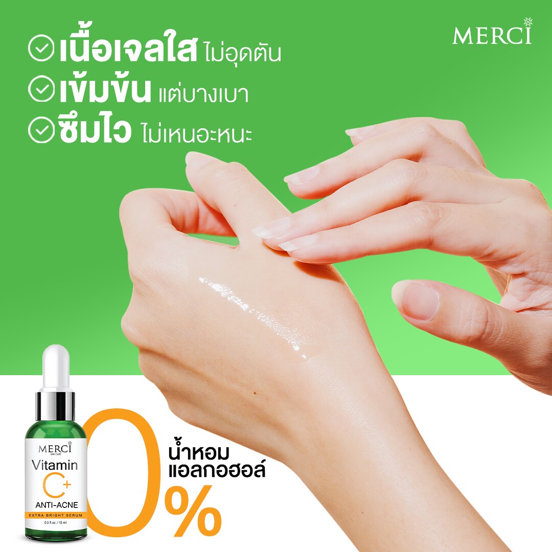 Merci Vitamin C+ Anti-Acne Extra Bright Serum The latest innovation in facial care products from Merci Vitamin C Serum to nourish the face with acne combines two benefits in one brightening, nourishing serum and acne gel. With the rapid action formula combined with imported extracts, the serum helps reduce acne as well as diminishing the tendency for new acne. After washing your face, apply 1-2 droplets of the serum onto your face and spread all over your face every morning and before bedtime, or apply the serum on the specific spot with acne. helps reduce acne as well as diminishing the tendency for new acne. Moreover, this Merci serum combines two benefits in one: brightening, nourishing serum and acne gel. This serum is fragrance free.