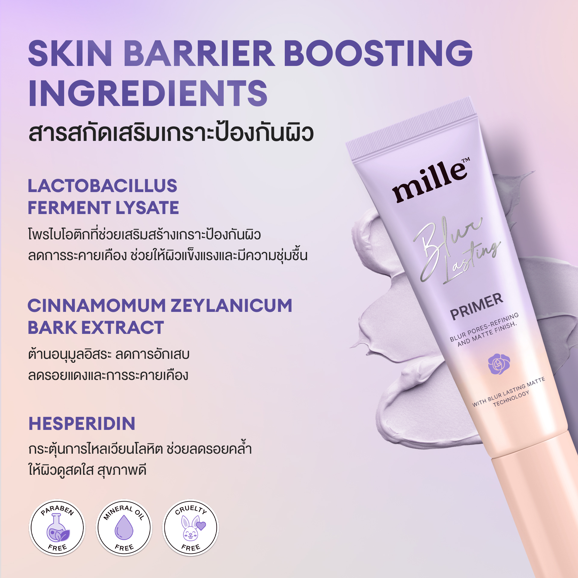 Mille Blur Lasting Primer a lightweight primer that instantly smooths the skin with Blur Lasting Matte Technology, creating a natural, flawless matte look that lasts all day. An innovative primer that blurs and smoothes skin, is free from parabens, and provides a matte look, controls oiliness, but is moist and not dry, and comes with skincare products to nourish the skin. Blurring the skin smoothly, controlling oil all day, but still maintaining moisture, helping reduce yellowness of the skin, brightening the skin, making it extremely radiant. No matter what kind of skin, it can be matte. People with oily skin, combination skin, and dry skin can use it comfortably. Beautiful skin is not out of reach. It is a convenient portable sachet. You can bring it out to apply anytime conveniently.