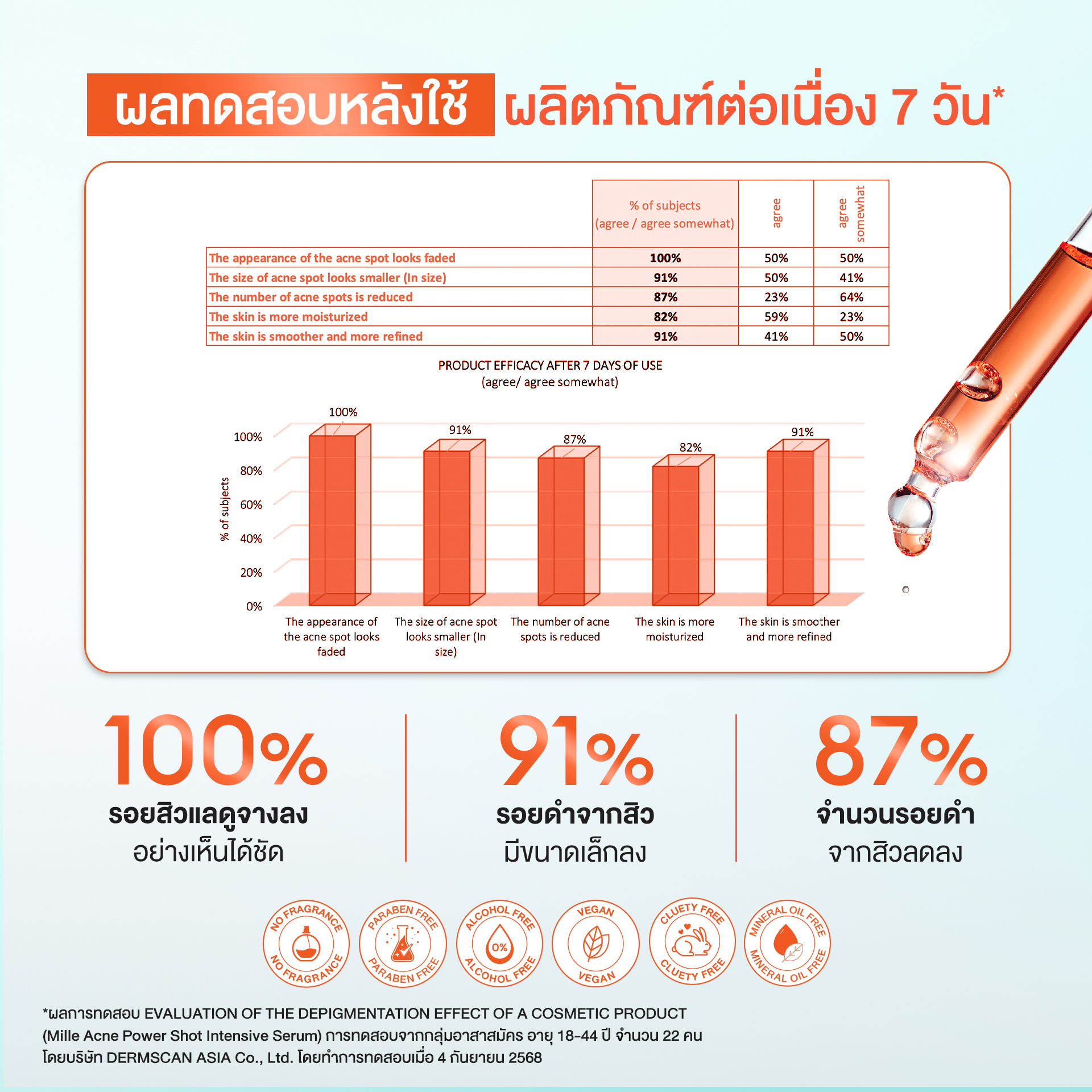 Mille Acne Power Shot Intensive Serum, a serum for acne scars, dark spots, and redness, applies to clogged pores, restores, and strengthens the skin's protective barrier. Acne scars are brighter within 7 days. It contains Niacinamide 5 Centerox Complex, a Dark Spot Healing Booster serum that takes care of redness and dark spots from acne, soothes skin from pollution, brightens skin, and makes skin tone more even. It moisturizes, leaving skin soft and smooth, not dry or flaky, and controls oiliness that is the cause of acne. Skin looks smoother, pores appear tighter, and restores the skin's protective barrier, strengthening the skin layer. Suitable for all skin types and sensitive skin.