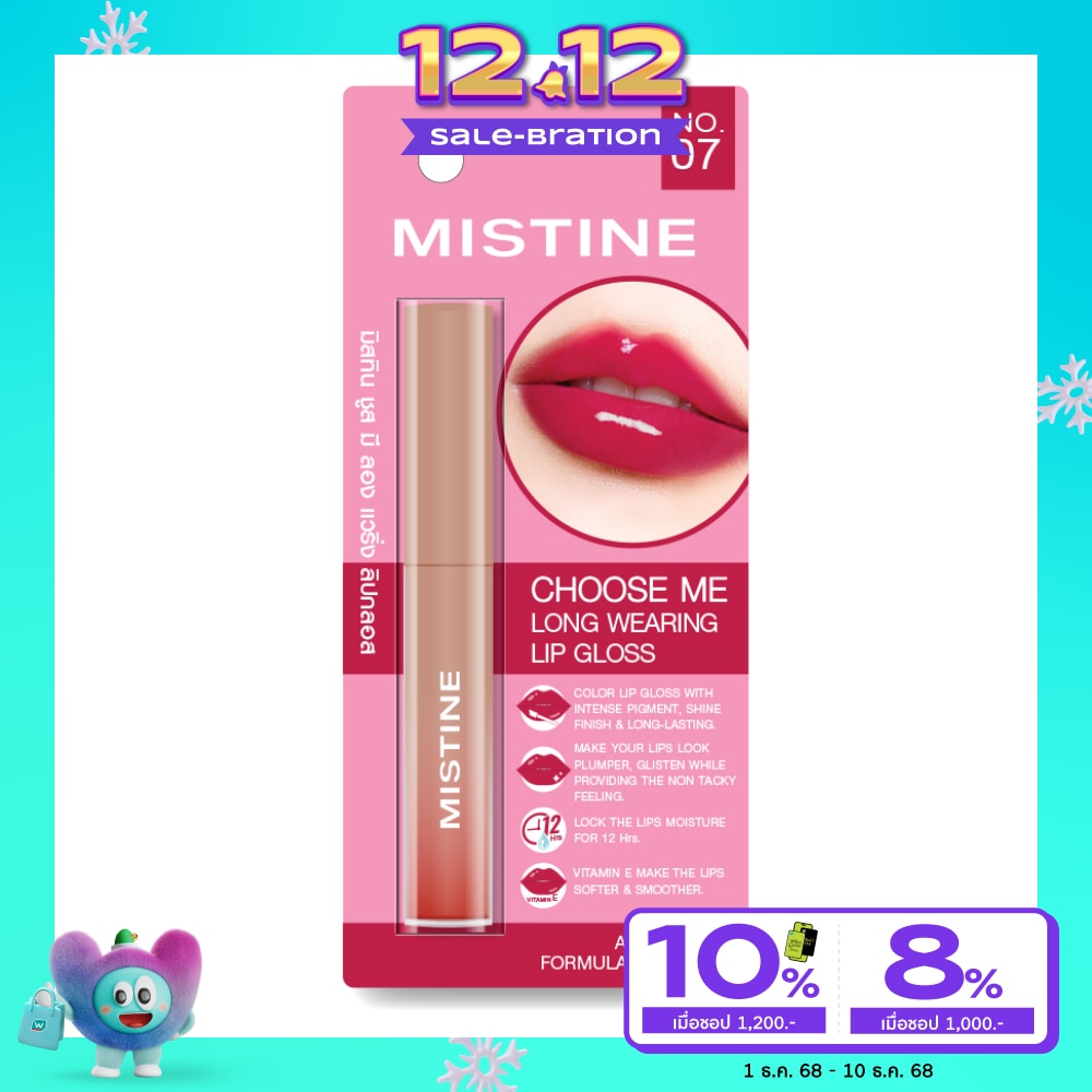 MISTINE CHOOSE ME Long Wearing Lip Gloss You will experience bright colors. smooth adhesion And show off the luster and splash of juiciness with Lip Color Gloss Lasts up to 9 hours and provides moisture for 12 hours. Lip gloss, intense color, juicy, shiny texture, long lasting, provides moisture that It blurs the lips and is an ultra-transparent gloss that fills in as soon as it hits the lips. The active ingredients help care for your lips and make them more lively. With Glossy Layer lock technology, it adds moisture, color, and adds plumpness to the lips to look volumized. Nourish your lips to be smooth, soft, and moisturized with Aloe Leaf Extract and Jojoba Seed Oil. Add moisture to the next level with Vitamin E to boost plump lips like a sexy girl. Rich in vitamin ACE that makes lips naturally smooth, radiant and plump. CRANBERRY EXTRACT is rich in vitamin AE to help nourish lips to be smooth, soft, and moisturized. SOFT BLUR TECHNOLOGY is a combination of small, spherical particles. Gives a soft, smooth, light touch, easy to spread and comfortable on the lips. There is also glitter film technology combined with fine, fine pigments. Helps coat the pigment to have long-lasting properties that do not flow and become greasy. Ready to help lock in moisture and shine on the lips From combining with the perfect ingredients of Natural Moisturizer Oil.