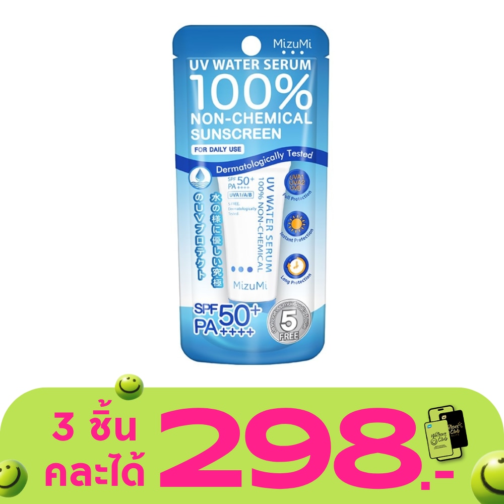Mizumi UV Water Serum SPF50+/PA++++Water based sunscreen for sensitive skin. Blue tube for daily use. 100 free of chemical sunscreens using the principle of irradiation. UVA1/UVA2/UVB which is the cause of dullness and premature aging from the skin light texture. Does not leave stains after setting Can be used by everyone in the family. Free from oils, fragrances, parabens, alcohol and synthetic colors.
