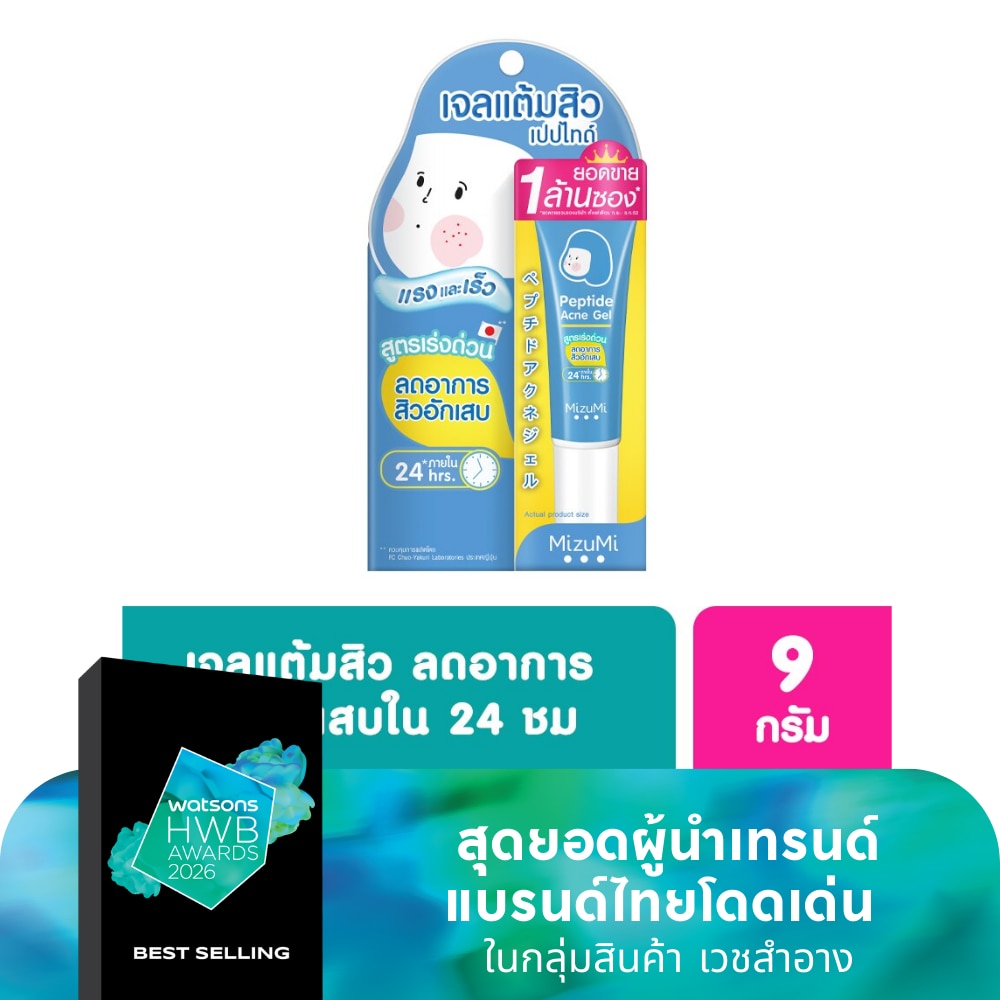 MizuMi Peptide Acne Gel 9gRapid results. In 24 hours*, acne inflammation is reduced. In 3 days*, acne lesions are significantly subsided.1. Oligopeptide-10 reduces acne bateria2. Phytosaccharide reduces P.Acne growth and regulates sebum secreation3. Vitamin B3 reduces red and dark spots caused by acnes4. Aloe Vera and Centella sooth and moisturize skinGentle formula, suitable for sensitive, acne-prone skin. Dermatologically Tested.*Consumer test run by Dermscan in 34 subjects who sufferred from acnes.