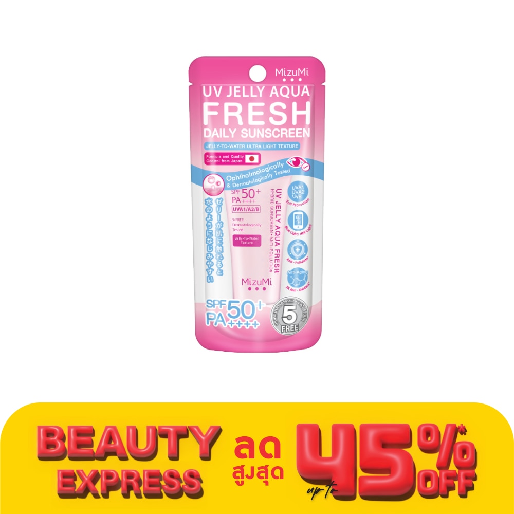 MizuMi UV Jelly Aqua Fresh formula sunscreen, Jelly-to-Water texture, refresh and helps skin looks bright. protect even the deepest skin grooves Protect dull skin, freckles, dark spots caused by sunlight. Strong UVA1/A2/B , 5 Free Dermatologically Tested . Protect your skin from Tara Tannins amp; Organic Sunflower Sprouts , Uji Green Tea, Chestnut Rose และ 3 LGA , Aloe Vera , Snow Jelly Mushroom and Coral Reef Friendly. Jelly texture, not greasy, easy to spread, absorbs quickly, does not stain. Skin Tested Passed the skin irritation test