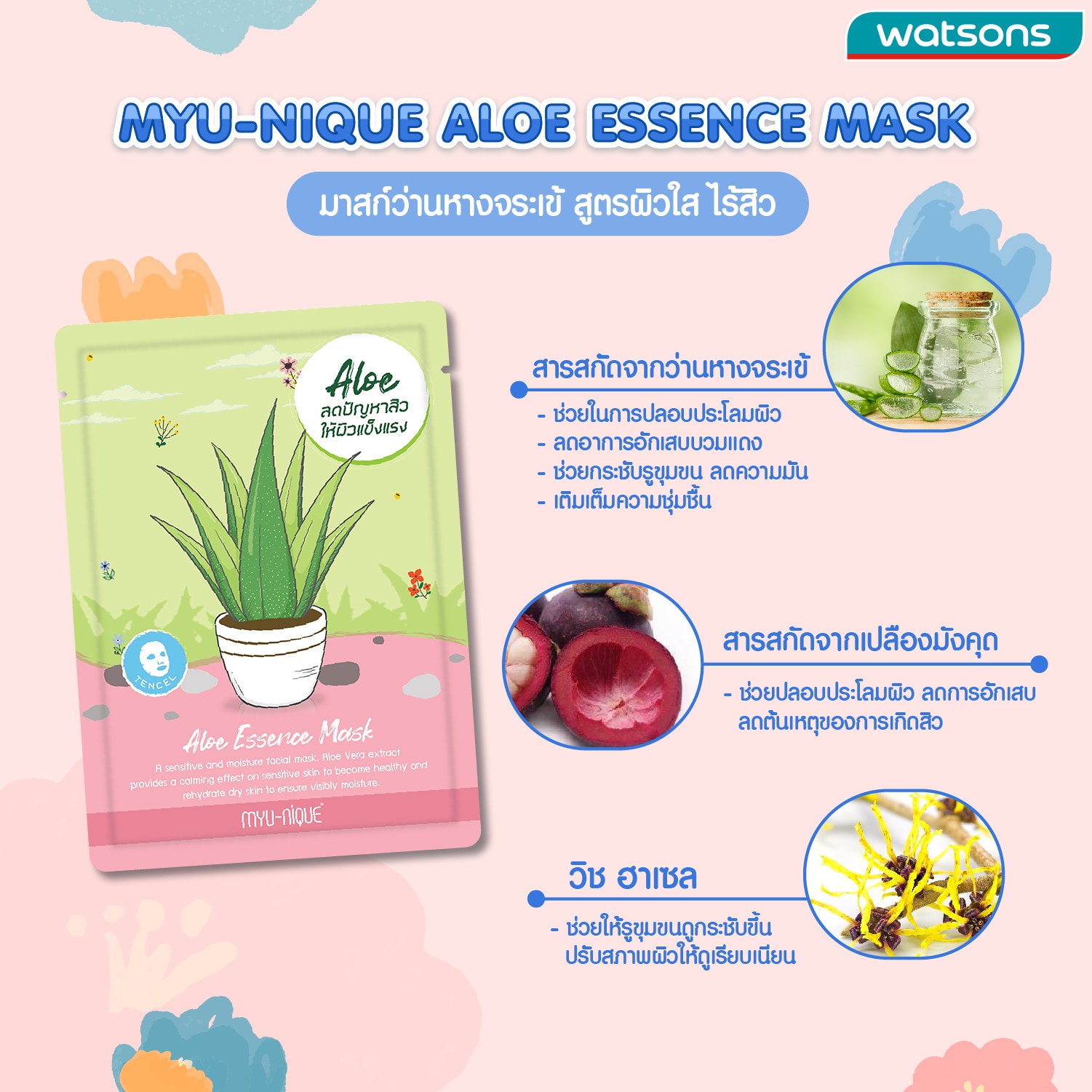 Myu-Nique Aloe Essence Mask A tencel facial mask sheet with light, non-sticky and intensive essence formulation. This essence mask sheet is formulated with Aloe vera extract; helps to rejuvenate skin damaged from sunlight and pollution, reduces causes of acne and give skin moisturizing effect. Mangosteen extract helps to ruduce causes of acne and anti-irritation. And Witch Hazel extract acts as pore minimizer and facial oil control. This essence facial mask sheet gives your skin moisture and looks flawless. For healthy looking skin without acne.