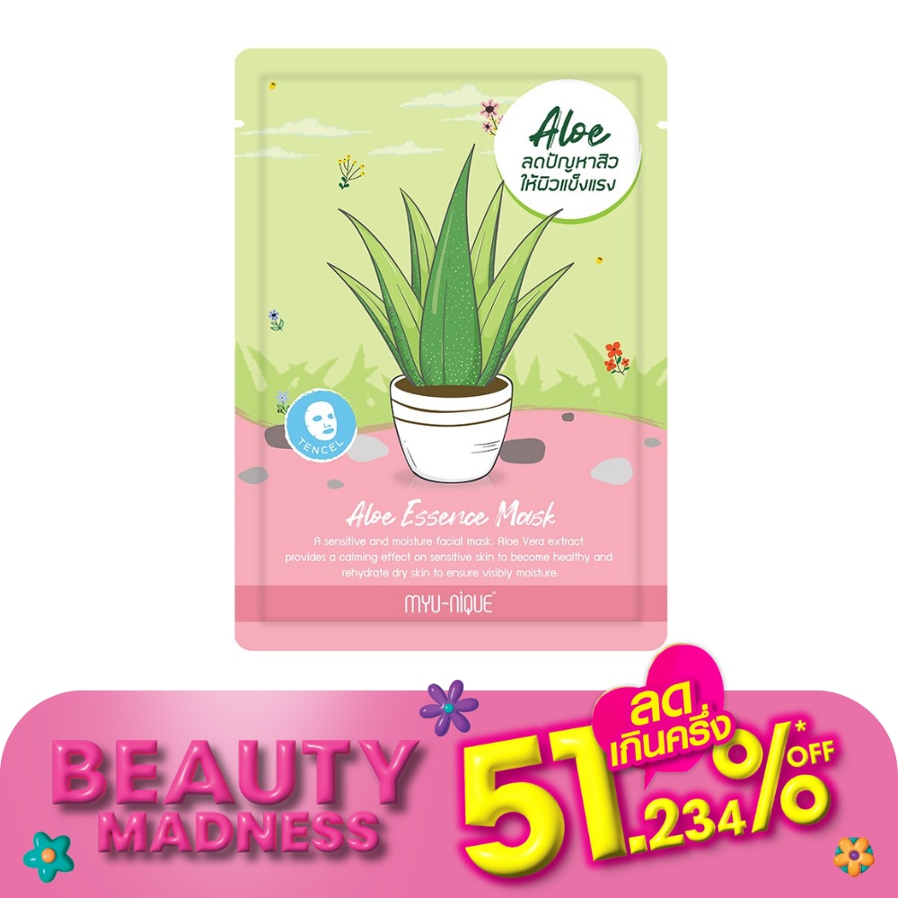 Myu-Nique Aloe Essence Mask A tencel facial mask sheet with light, non-sticky and intensive essence formulation. This essence mask sheet is formulated with Aloe vera extract; helps to rejuvenate skin damaged from sunlight and pollution, reduces causes of acne and give skin moisturizing effect. Mangosteen extract helps to ruduce causes of acne and anti-irritation. And Witch Hazel extract acts as pore minimizer and facial oil control. This essence facial mask sheet gives your skin moisture and looks flawless. For healthy looking skin without acne.
