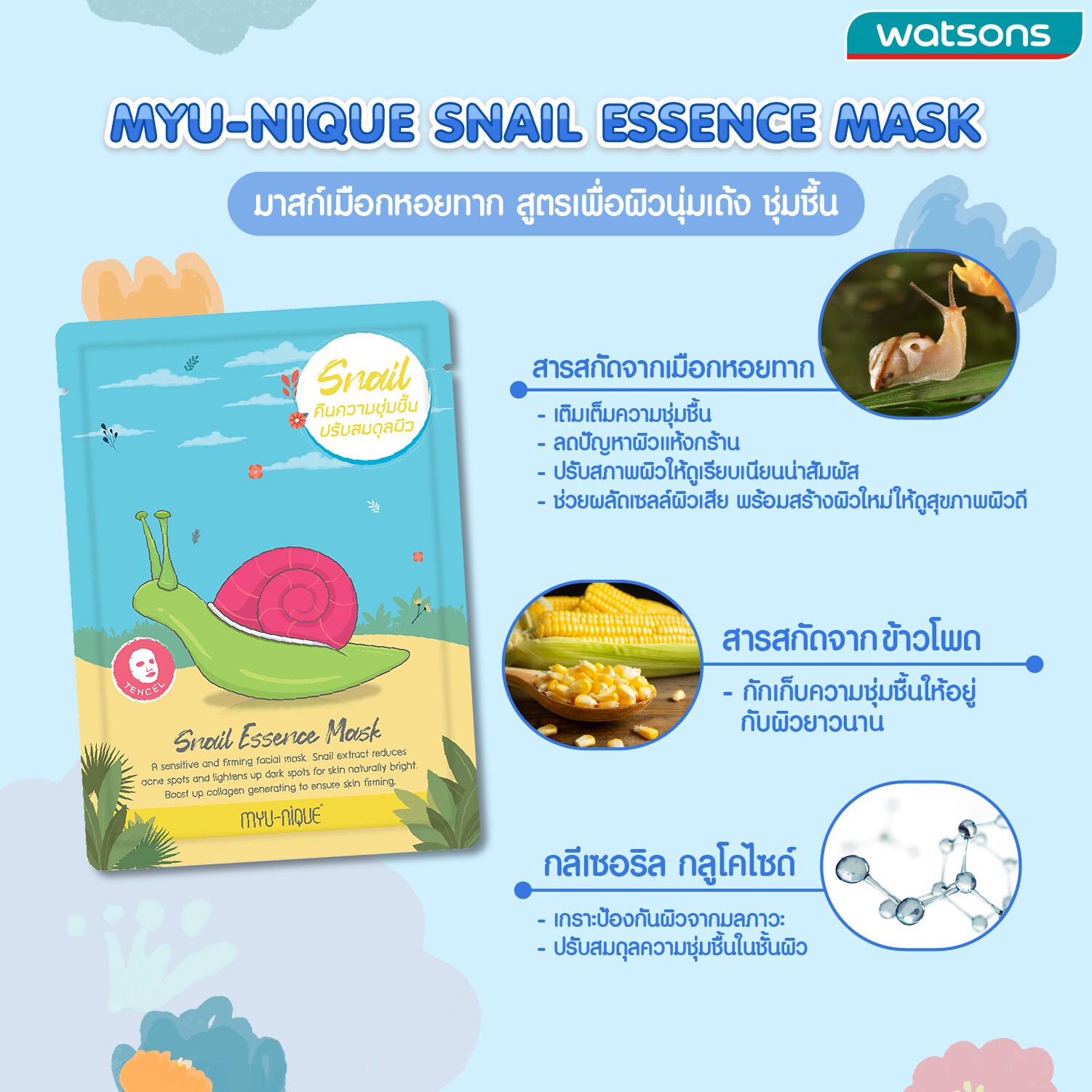 Myu-Nique Snail Essence Mask a tencel facial mask sheet with light, non-sticky and intensive essence formulation. This essence mask sheet is formulated with snail secretion filtrate; for calming, gives skin moisturizing effect and mild skin exfoliating. Corn extract helps to restore moisture content in skin, keep a long time skin moisture effect and smooth skin texture. Glyceryl Glucoside hekps to regenerate skin balancing and give health looking skin. This gives skin a smooth and moisturizing effect. Also . For moist, smooth and pleasant skin touch.