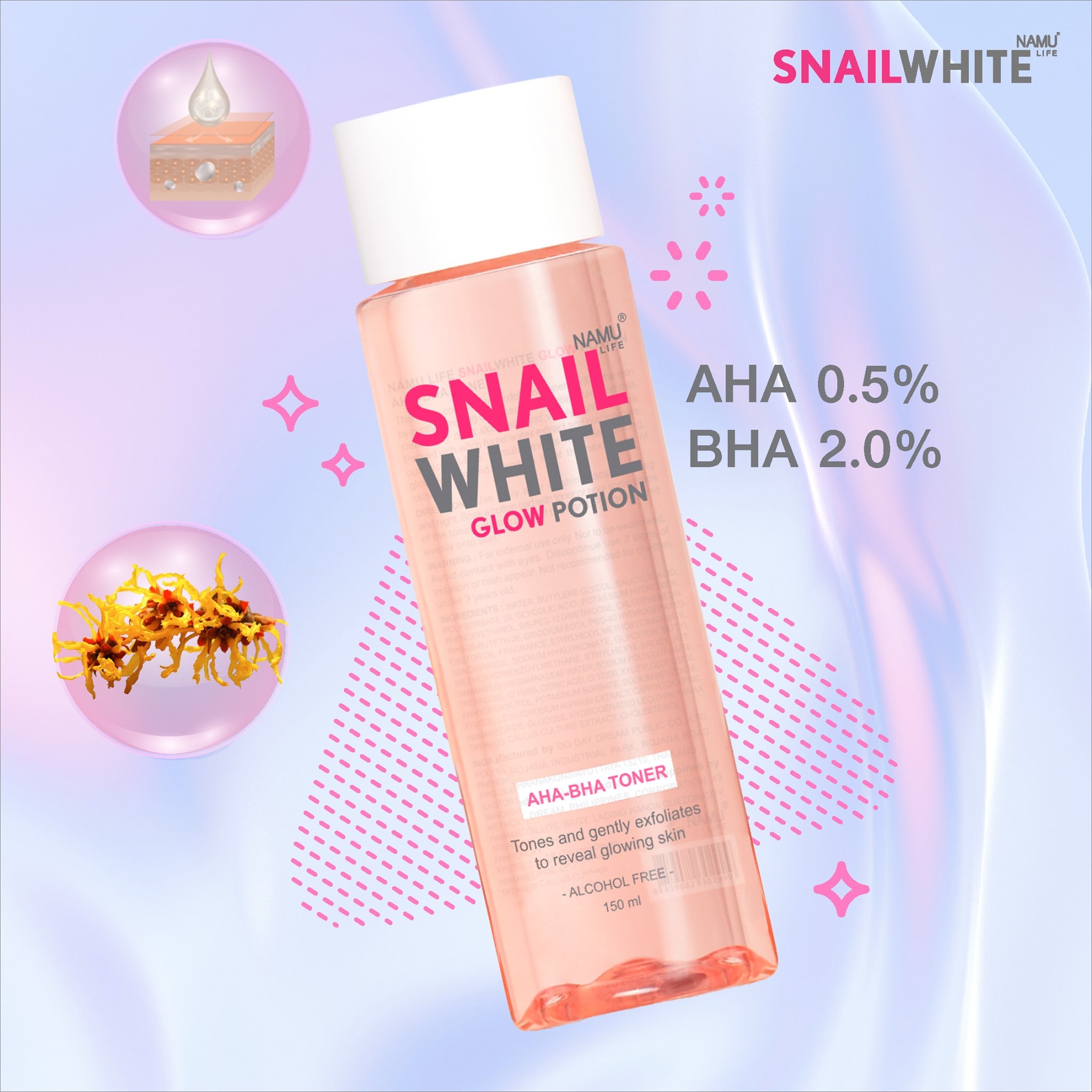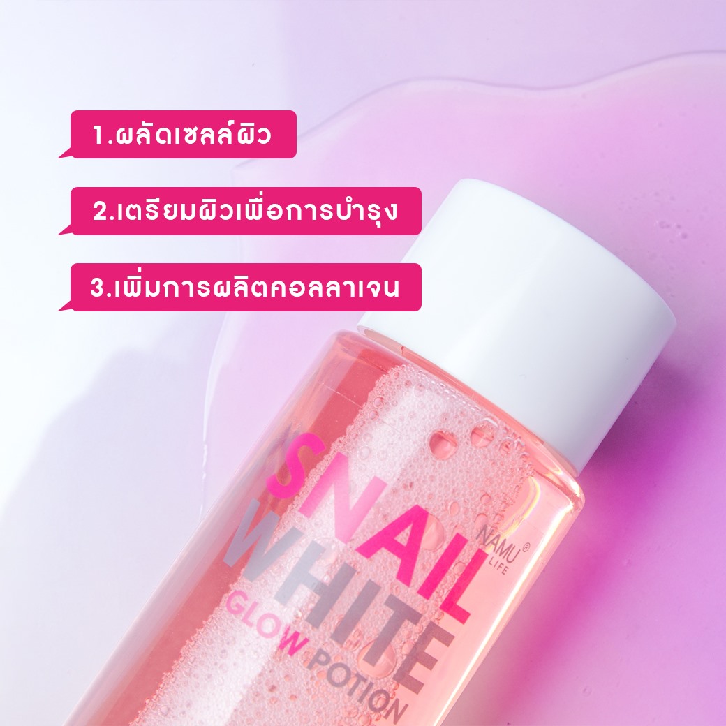นามุ ไลฟ์ สเนลไวท์ โกลว์ โพชั่น โทนเนอร์ น้ำตบที่จะช่วยผลัดเซลล์ผิวที่ตายแล้วอย่างอ่อนโยน เผยผิวใสโกลว์ กระชับรูขุมขนให้ผิวดูเนียนเรียบ เพิ่มความชุ่มชื้นให้แก่ผิว ให้ผิวสดชื่นเปล่งปลั่งสุขภาพดี AHA และ BHA ช่วยขจัดสิ่งสกปรกอย่างงล้ำลึกและอ่อนโยน ลดการอุดตันของรูขุมขน กระชับผิวให้ดูเรียบสม่ำเสมอ Hyaluronic Acids เพิ่มความชุ่มชื้นให้ผิว กักเก็บน้ำให้ผิวเด้ง ไนยาซินาไมด์และสารสกัดจากโสมช่วยเผยผิวสดใสและสุขภาพดี Witch Hazel และสารสกัดจาก Alpine Willowheerb จากเทือกเขาแอลป์ ช่วยปลอบประโลมผิว และเตรียมผิวหน้าสำหรับการบำรุงในขั้นตอนต่อไป เหมาะกับทุกสภาพผิว