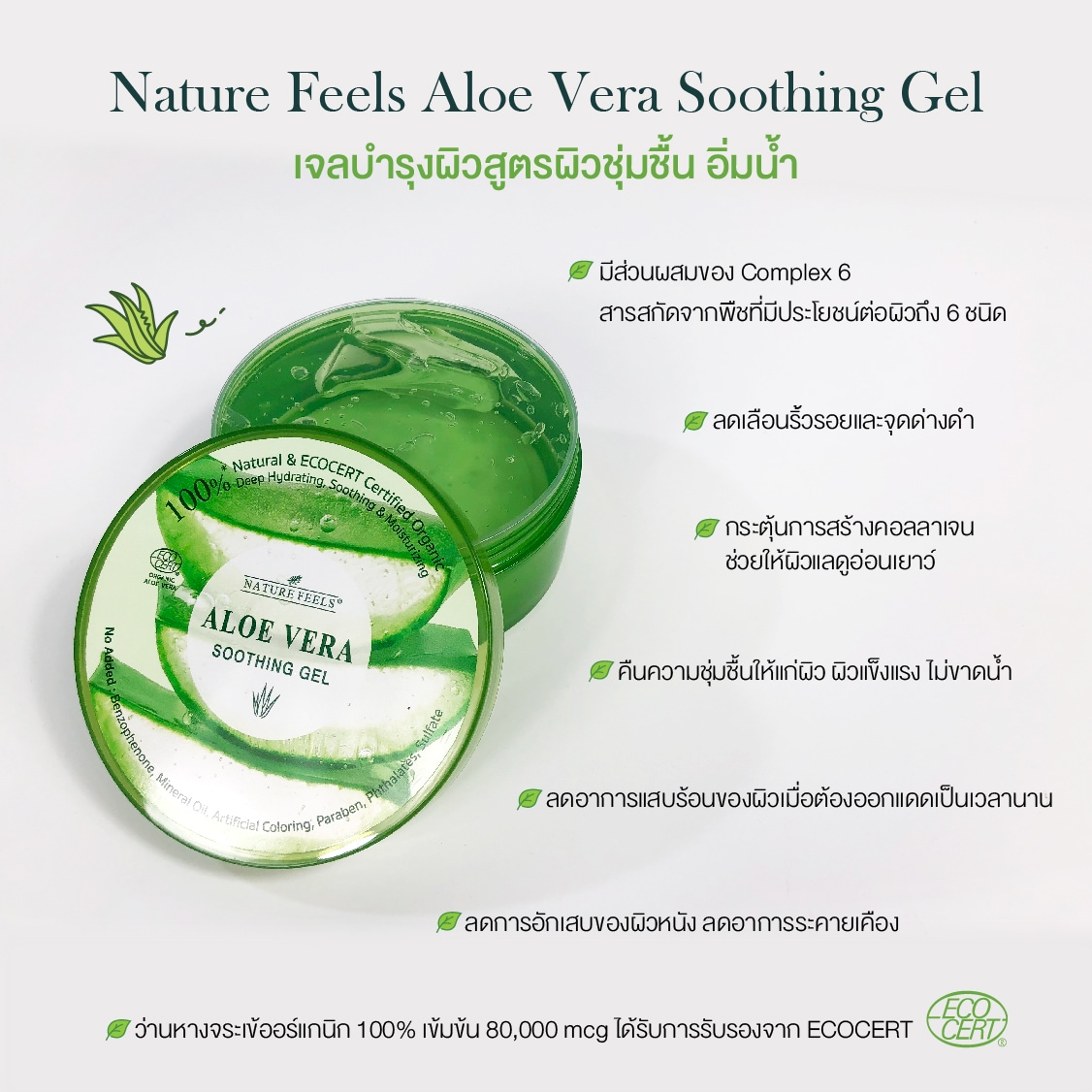 Nature Feels Aloe Vera Soothing Gel A light texture Aloe Vera soothing gel with non-greasy formula. Contains 100% organic Aloe Vera extract and Natural Herb Complex 6 extract that helps to rejuvenate, keep skin moisture, relieve inflammation after the sun, and leaves your skin fresh. This soothing gel can get absorbed deeply and provide long lasting moisture.NATURE FEELS ALOE VERA SOOTHING GEL is formulated with non-irritating ingredients so it can be used for all skin types. Apply an appropriate amount onto facial and body skin often for the best results.