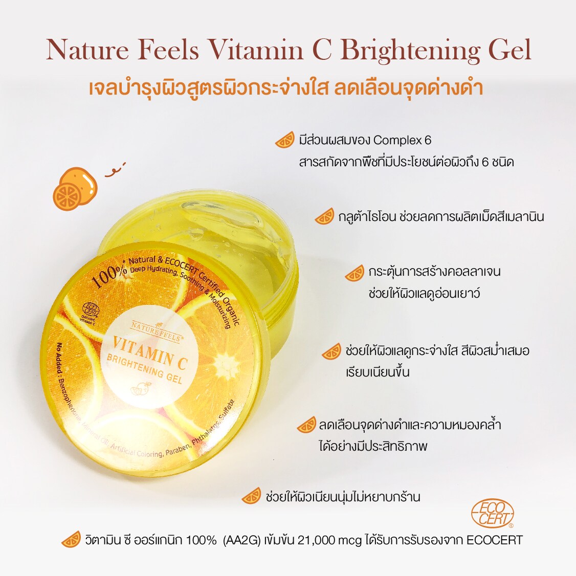 Nature Feels Vitamin C Brightening Gel A light texture vitamin C brightening gel with non-greasy formula. Contains 100% organic derivative of vitamin C, AA2G from Japan, and Natural Herb Complex 6 extract that helps brighten up skin, reduces dark spots, well-nourished and leaves your skin fresh. This brightening gel can get absorbed deeply and provide long lasting moisture.NATURE FEELS VITAMIN C BRIGHTENING GEL is formulated with non-irritating ingredients so it can be used for all skin types. Apply an appropriate amount onto facial and body skin often for the best results.