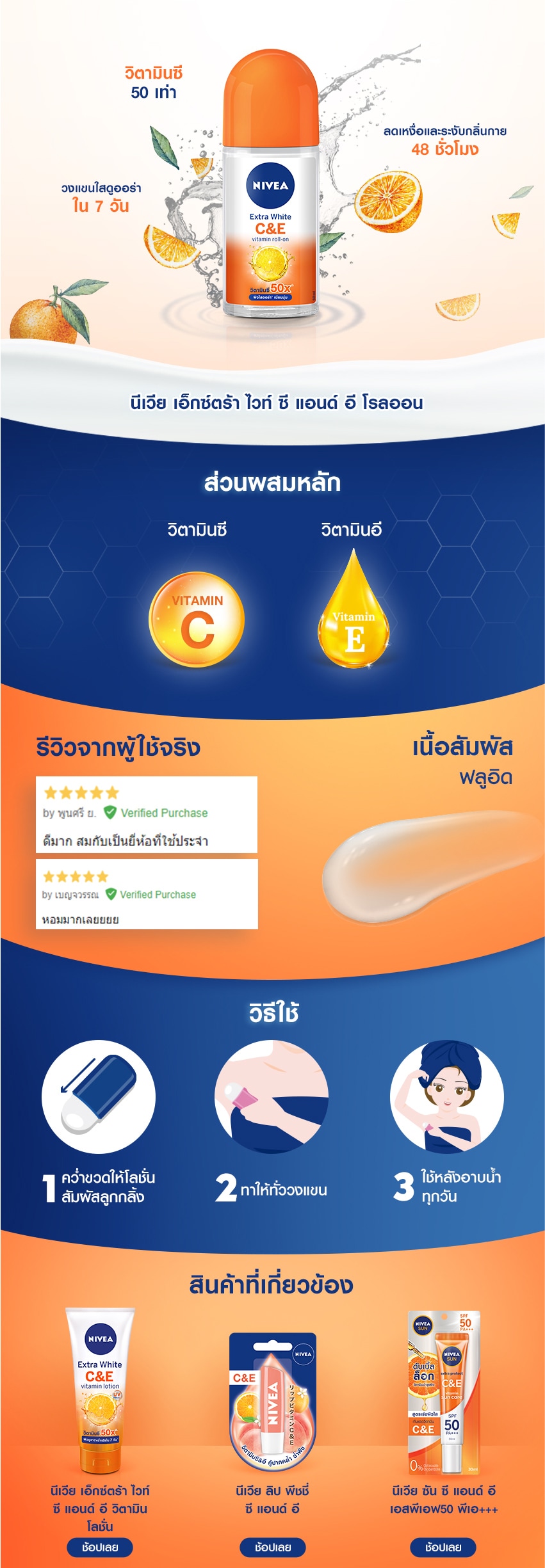 Nivea Deo Roll-On Extra White C&E The first vitamin roll-on from NIVEA, with 50 times concentrated Vitamin C & Vitamin E. For a visibly brighter and softer underarm skin in 7 days. Gentle to skin with 0% alcohol formula. Stay fully protected with 48 hrs sweat and odor protection.