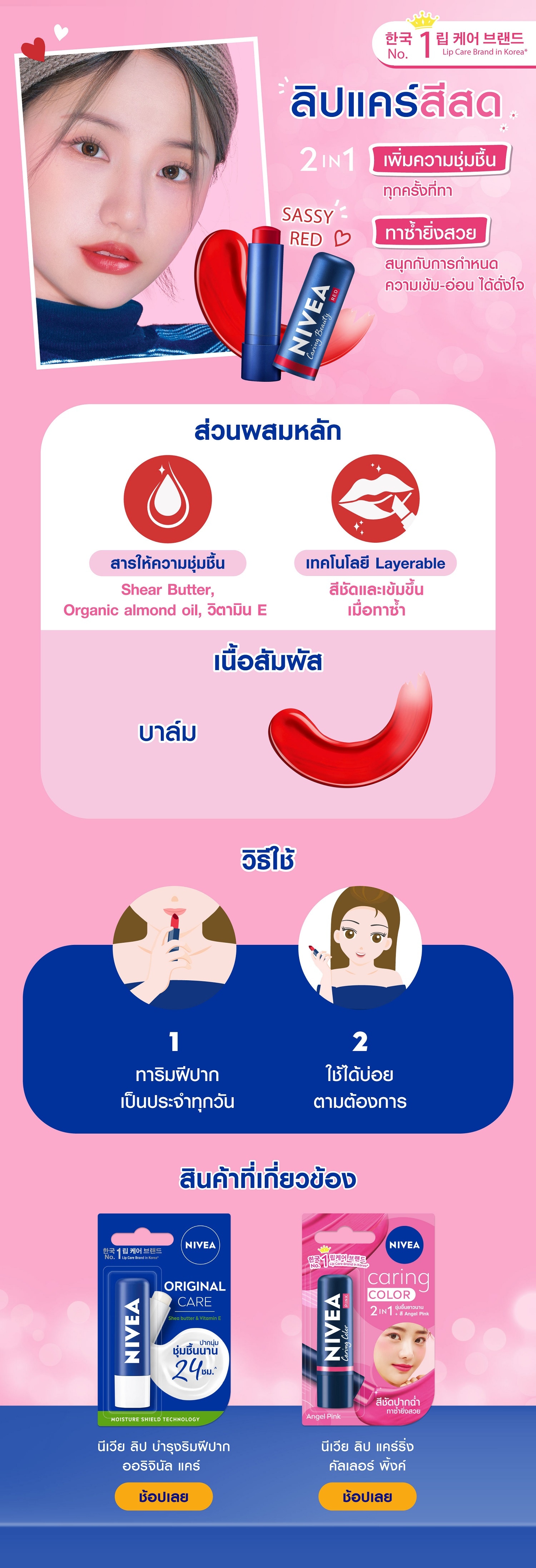 Nivea Lip Caring Color Sassy Red Brilliant color plus moisture, even better with more layers. Moist and color lip care for daily usage. Softly nourished lip with trusted care of NIVEA The formula with shea butter, organic almond oil and vitamin E provide intensive moisture for each application. Brilliant Sassy red color with Layerable technology. Enjoy color intensification by applying multiple layers as you wish Light color for easy day or gorgeous color for party time. Skin compatibility dermatologically approved. Beiersdorf calculation based in part on data reported by Nielsen through its Market Track Service for Korean Lip Care Category for the period of January 2018 to December 2020 (Copyright 2021, The Nielsen Company.)
