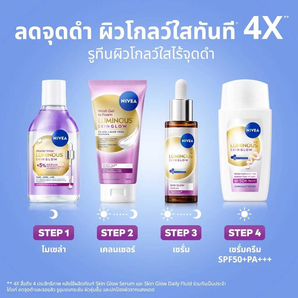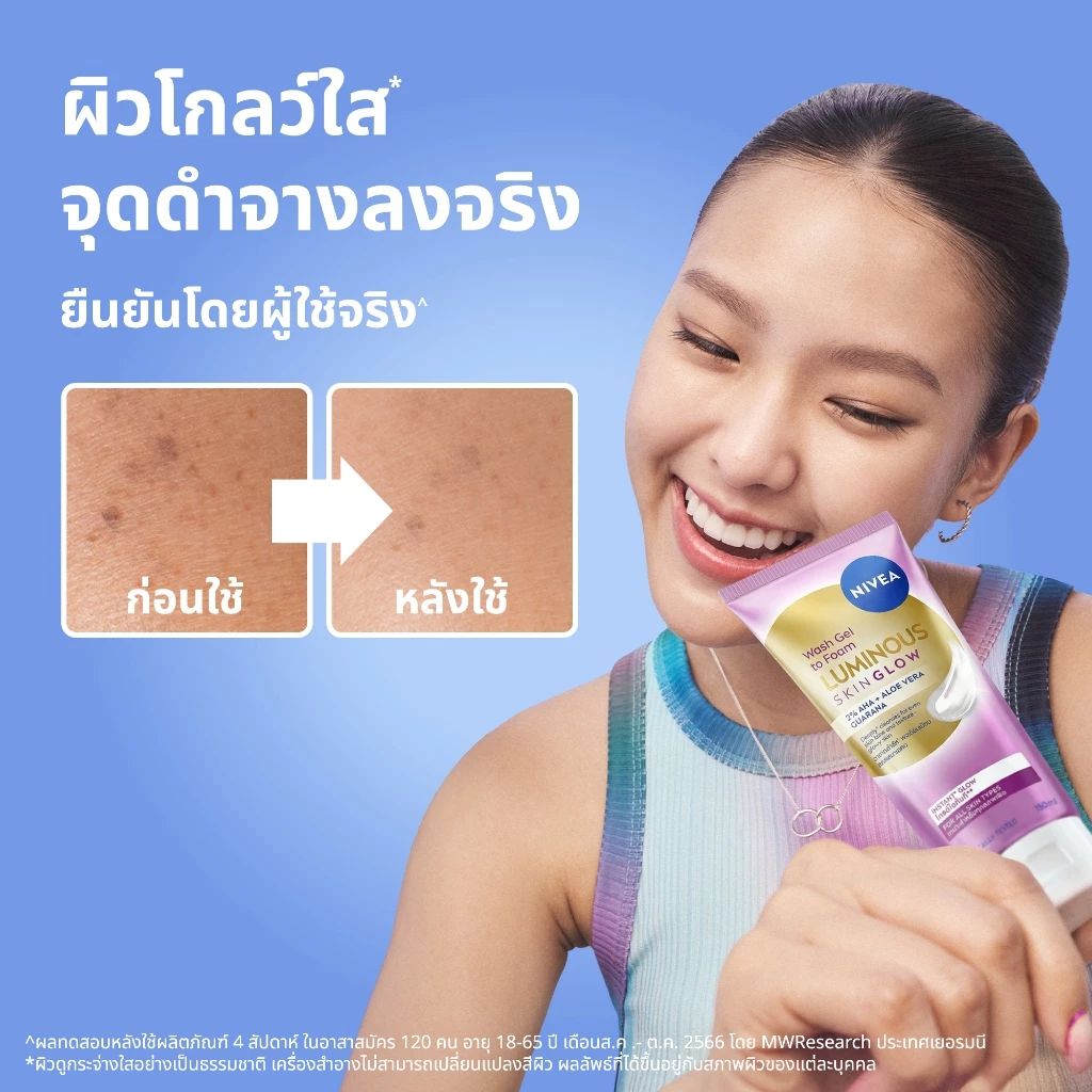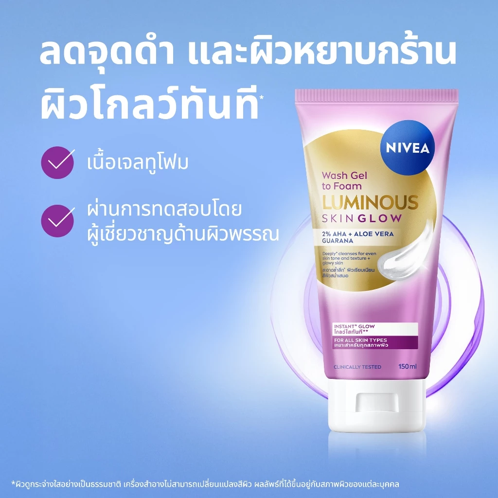 NIVEA LUMINOUS630 SKIN GLOW WASH GEL TO FOAM Deeply cleanses and acts on the three dimensions of glow: Oil removal: anti-shine effect for a clear and radiant skin Smoothness: smoothens skin in 2 weeks Skin renewal look: exfoliates and visibly evens skin. -Cleanses deeply for even and instant glowing complexion. 96 agreed gently exfoliates skin. No perfume. -SKIN COMPATiBILITY DERMATOLOGICALLY TESTED -Within epidermis layer Studied in 30 participants, aged between 30-64 years old, in 2023 by Allergisa Pesquisa Dermato Cosmetica LTDA, Brazil. Studied in 120 participants, aged between 18-65 years old, in 2023 by MWResearch GmbH, Germany. Instantly reveals a fresh, glowing look after cleansing.
