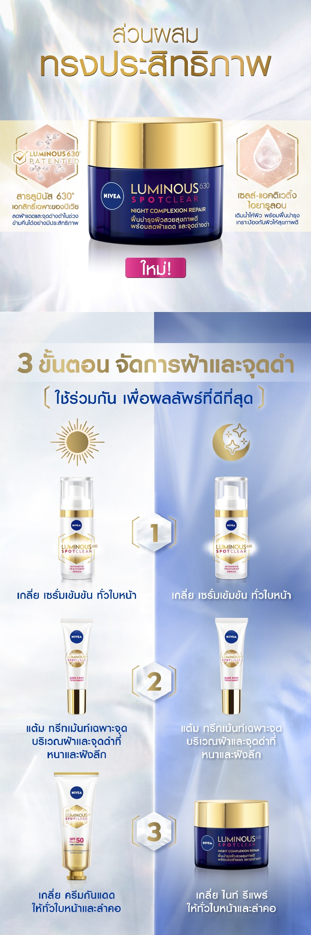 Nivea Luminous 630 Spot Clear Night Complexion Repair Revitalize and recharges skin overnight while reducing melasma and dark spots at cellular level. Visible results in 4 weeks Reveal beautiful heatlhy and radiant skin every morning Restore skin complexion night after night with 2 actions 1. Every Night With innovative cell-activating Hyaluronic Acid increases moisture level in the skin while regenerates and strengthens the skin barrier 2. Overtime patented LUMINOUS630 works to visibly reduce melasma and dark spots while you sleep. For a revitalised skin and a more luminous skin complexion. Visible results in 4 weeks. Recommended by skin experts. Suitable for all skin type, also for sensitive skin.
