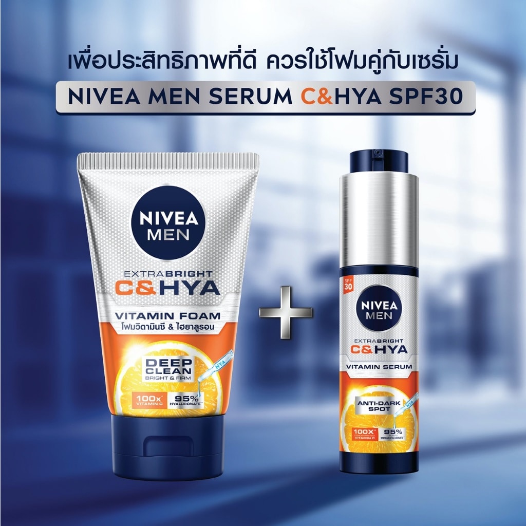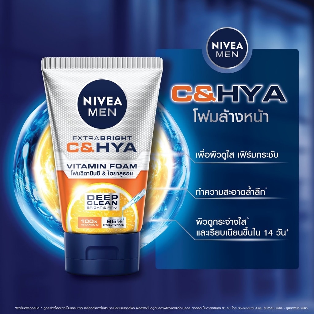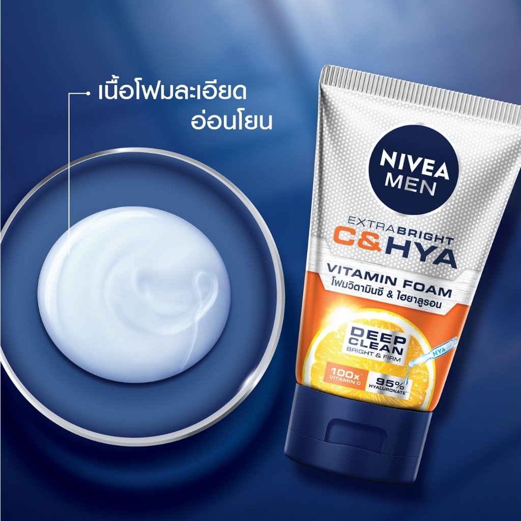 Nivea Men Extra Bright C & Hya Age Defense Vitamin Foam Cleansing foam for normal-oily skin, accumulated dark Instant refresh with 100X concentrated Vit C that helps to reduce deep dark spot for radiant, firmer, smoother skin with 95% purity Sodium Hyaluronate WHAT DO YOU GET 1. Reduced dark spots 2. Brighter skin 3. Tighter pores USAGE Lather up and gently massage over wet face avoiding eye area. Rinse off with clean water. For better results ,use with NIVEA MEN C&HYA VITAMIN SERUM Compare to previous NIVEA MEN foam formula Refer to raw material data