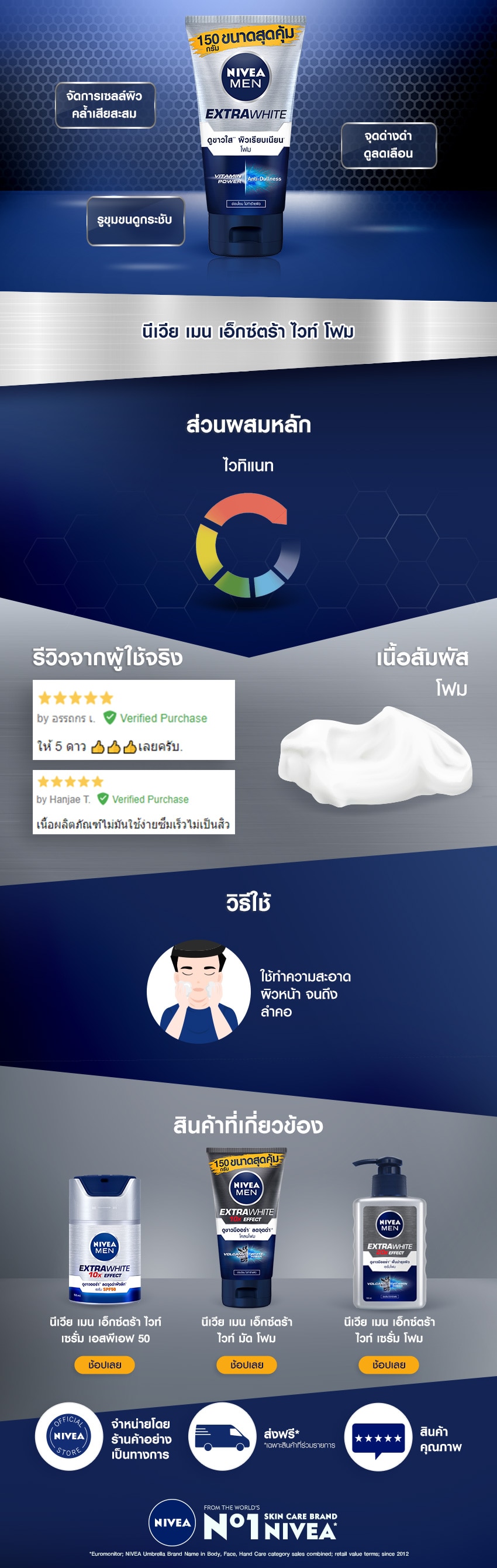 Nivea Men Extra White Spot & White Foam The radiant power 10 times in 1 minute 10 Commandments to reduce skin problems. 1. consistently clear skin 2. It reduces the oily Skin 3. Reduce the appearance of dark spots. 4. Tighten pores 5. Do not hurt your skin sensitive to the sun.6. Reduce the occurrence of acne and pimples. 7. Does not leave residue 8. skin soft and smooth 9. Do not drying out the skin 10. reduce clogging.