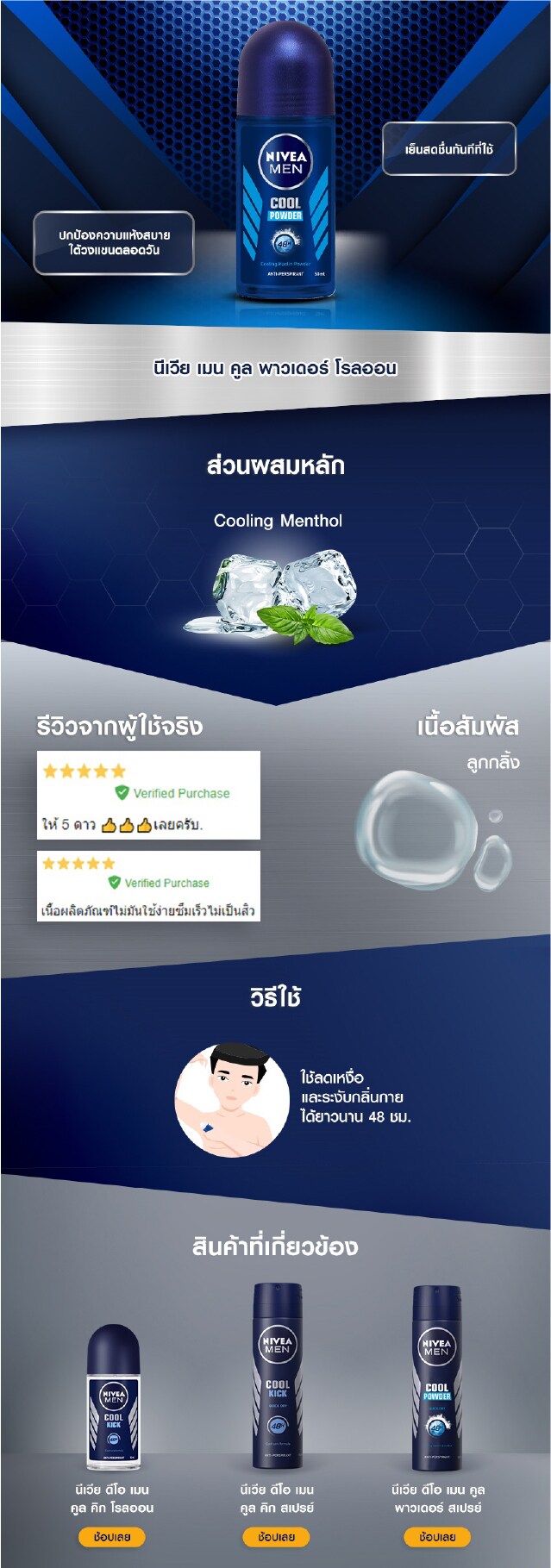 Nivea Men Cool Powder Spray help reduce sweat and deodorant. With extreme cold formula. Permeability to the skin layer Extreme cooling power with long-lasting, long-lasting scents to keep your skin comfortable, even in hot weather, lasting up to 48 hours and no chemical irritant.