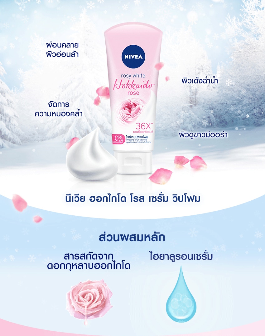 Nivea Rosy White Hokkaido Rose Serum Whip Foam is enriched with Alba Rose from Hokkaido which contains 36X Anti-Oxidant to deeply cleanse protect skin against digital free radicals to restore radiance for healthy rosy skin. Benefits - 36X Anti-Oxidant to protect skin against digital free radicals - Deeply cleanses dirt, pollutants and makeup residue that cause dull tired skin, leaving skin feeling clean and soft after wash - Restores skin's radiance with complexion noticeably brighter Wash daily, be careful around eye area.