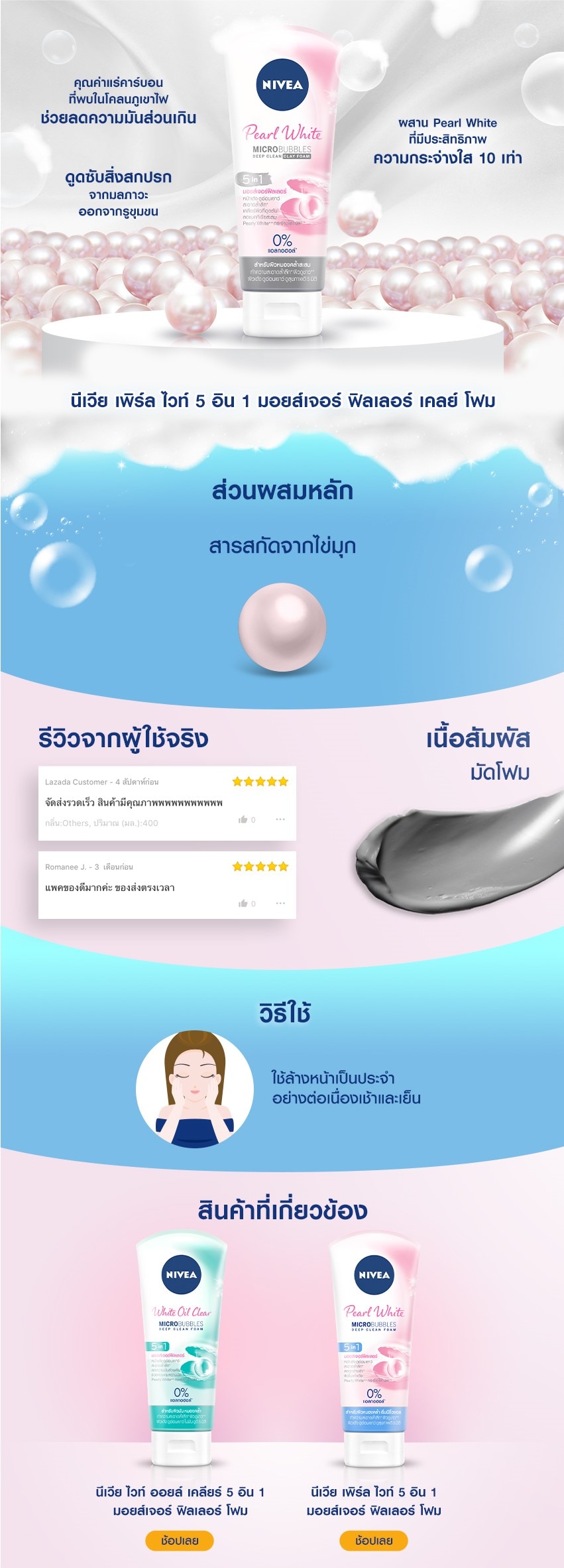 Nivea Pearl White 5in1 Moisture Filler Clay Foam NIVEA Pearl White Microbubbles Deep Clean Clay Foam enriched with Black Rice Kaolin Clay to deeply cleanses, purifies brightens.to provide 5 in1 skin benefits for 10x brightening, clears clogged pores, anti-whitehead, removes blackheads, natural radiance. It is suitable for normal to oily skin types. Benefits - Deeply cleanses impurities and excess sebum from pores - Minimizes the appearance of pores - 10x better brightening effect vs. Vitamin C - Non-comedogenic - Skin compatibility dermatologically proven