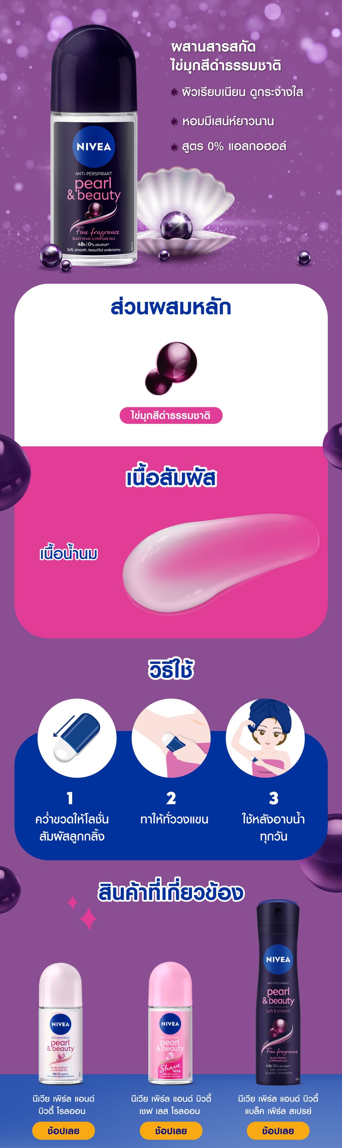 Nivea Roll On Pearl & Beauty Black Pearl Contains precious natural black pearl extracts that smoothen and brighten underarm skin. Enriched with perfume oils, for long lasting charming scent. Contains 0% alcohol. Apply evenly on to the underarm skin. 48 hrs. sweat & odor protection with lasting scent Natural black pearl extracts. Contains precious natural black pearl extracts that smoothen and brighten underarm skin. With long lasting charming scent. sweat & odor protection with lasting scent Natural black pearl extracts. Contains 0% alcohol. 1. Carefully read the How to Use section and adhere to it. 2. Stop use if irritation develops or an allergic reaction occurs