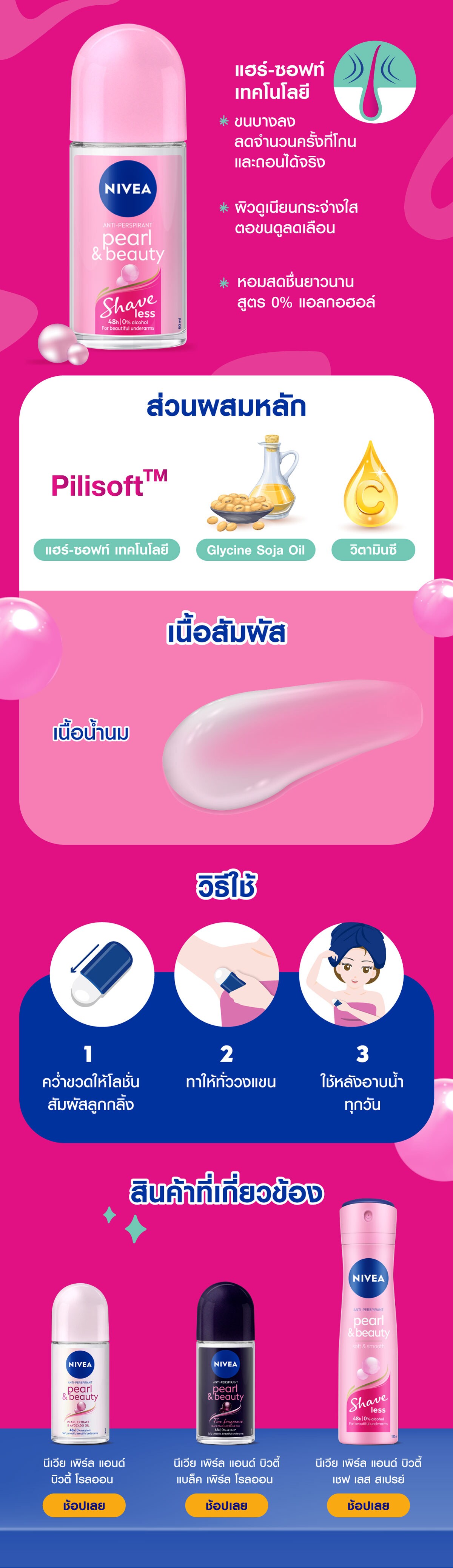 Nivea Roll On Pearl & Beauty Shave Less The first deodorant with Hair-Soft technology that thins out underarm hair and reduce hair stubble. For long lasting smoother and brighter underarm skin. Proven to reduce frequency of hair removal. Lasting fresh floral scent. Contains 0% alcohol. The first deodorant with patented Hair-Soft technology developed from natural plant extracts, exclusively from NIVEA that thins out hair deeply in the pores. Proven to reduce the frequency of shaving/plucking. Reduce stubble and ingrown hair for white and smooth underarm skin, staying hairless longer 48 hrs. sweat odor protection and lasting scent from natural pearl extracts.
