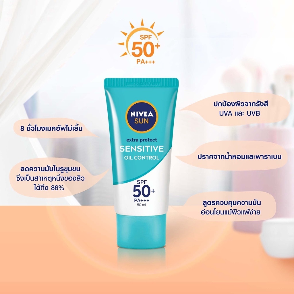 NIVEA Sun Protect & Sensitive Oil Control serum 50ml for sensitive skin perfect for daily use without perfume and paraben. It helps prevent makeup melt-free because of L-carnitine
