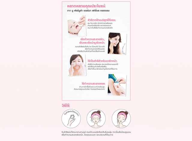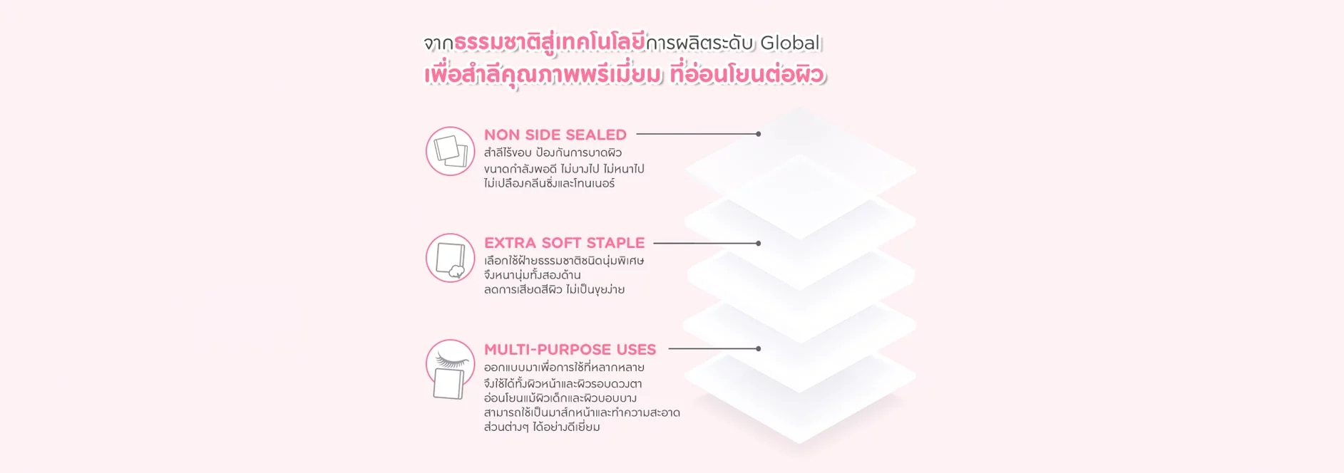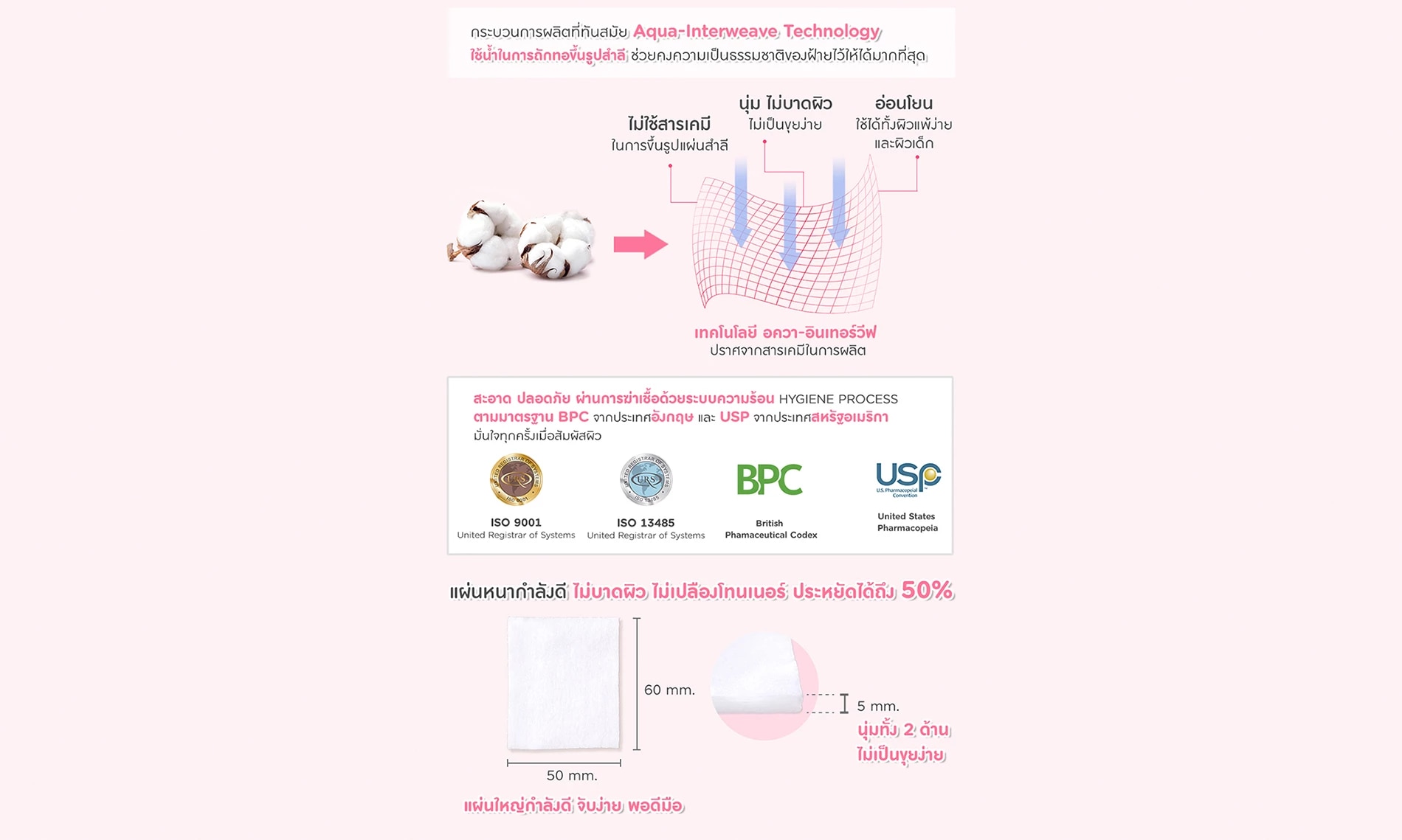 This gentle facial cotton is made from 100% natural soft cotton guaranteed by the Pharmaceutical manufacturing standard of England (BPC) and United States of America (USP). With global technology procession, it provides hydrophilic texture, denser and smoother touching which is safe for all skin types including sensitive skin without any irritation. No Fluorescent Meterials. No Chemical Coating. No Residue.