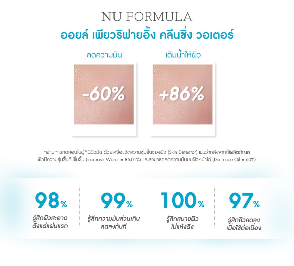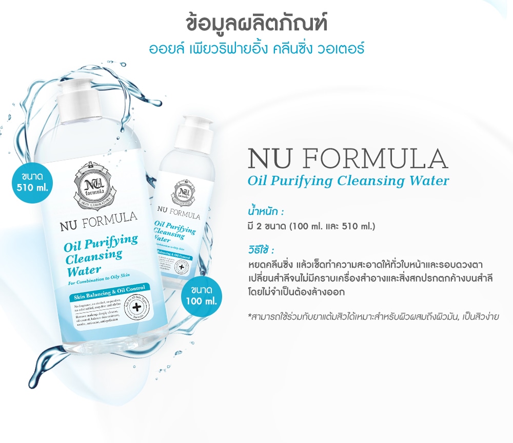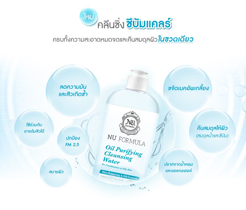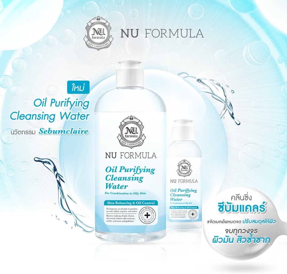 Nu Formula Oil Purifying Cleansing Water This specially formulated Sebumclaire Technology removes makeup and cleanses dirts pollution and excess oil without drying out or substances that irritate the skin. It limits sebum control and anti-acne effectively. With an ultra-light texture this micellar water provide easy yet effective cleansing on face and eye areas while leaving the skin refreshing with no residue behind. Zinc PCA regulated sebum control and anti-acne. Licorhizate and Hyaluron soothe and restores the skin barrier. No Fragrance, Oil, Alcohol, Paraben, Silicone, Soap, Color Added