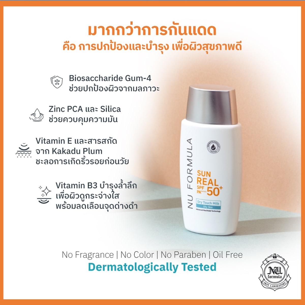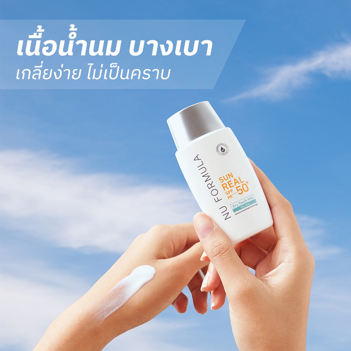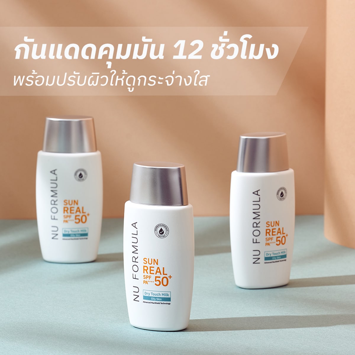 Nu Formula Sun Real SPF50+ PA++++ Dry Touch Milk First time for sunscreen with the REAL SPF. The Advanced Maxshield Technology from Nu Formula is the combination of sunscreens that help to protect the skin to the maximum extent, with the nanoparticle sunscreen. The SPF Booster help to increase dispersion ability to ensure the sunscreen