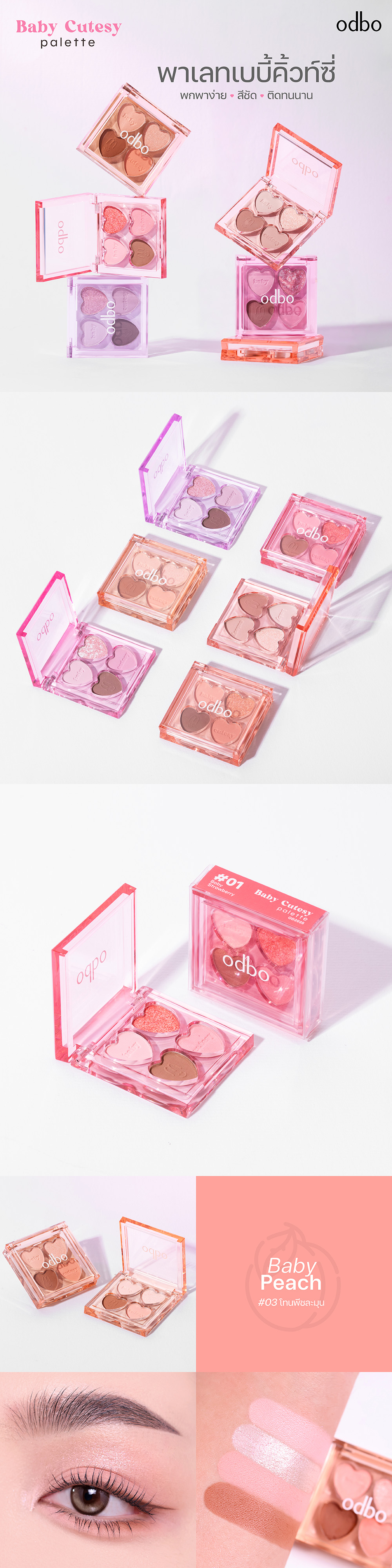Create the cutest eye looks with odbo Baby Cutesy Mini Palette This tiny but mighty palette features four versatile shades that blend seamlessly together, offering a perfect mix of matte and shimmer finishes. With highly pigmented, long lasting colors, it is designed to be beginner friendly while still allowing endless creativity.The adorable heart shaped pans add a playful touch, making it a must-have for any makeup lover.Available in 6 shades:01 Baby Strawberry 02 Baby Grape 03 Baby Peach 04 Baby Milk 05 Baby Berry 06 Baby Pumpkin
