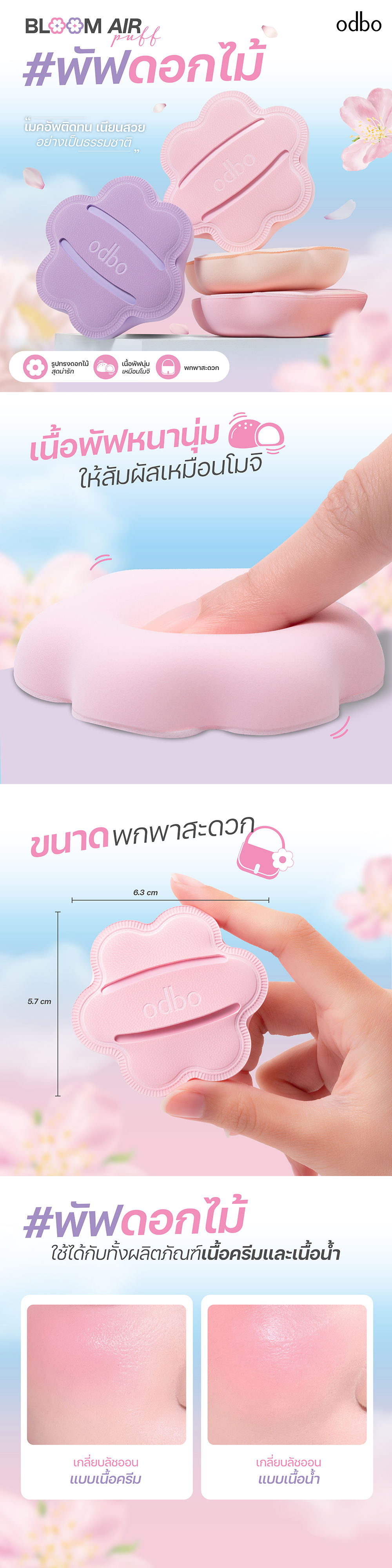 Meet the odbo Bloom Air Puff the cutest flower shaped puff with a soft mochi like texture Its flexible design adapts perfectly to your face and hand pressure helping blend foundation concealer and cream or liquid blush seamlessly for a smooth natural finish Lightweight yet durable it glides evenly without streaks or caking leaving your skin looking flawless from every angle. Designed to fit comfortably in your hand it allows precise control even on delicate areas like around the eyes or nose Compact and easy to carry it s perfect for daily use or quick touch ups anywhere anytime