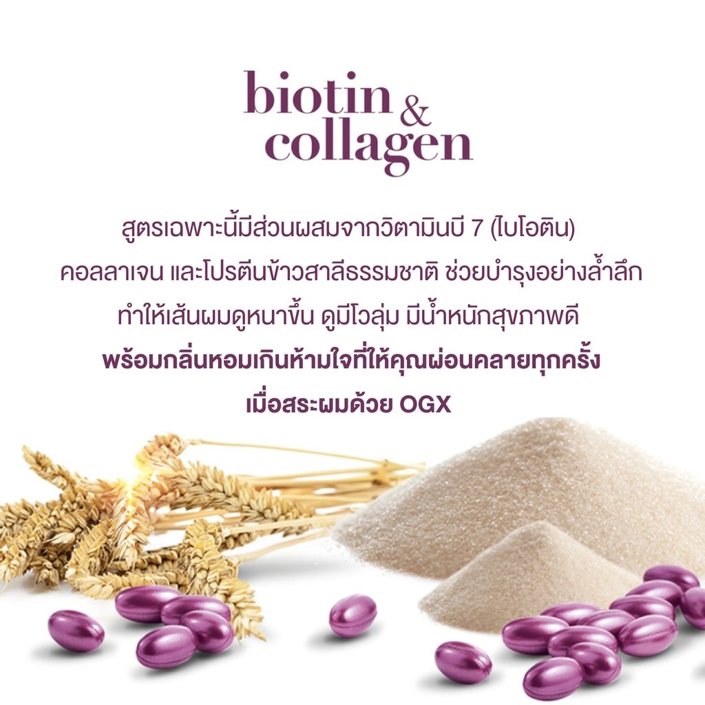 OGX Thick & Full + Biotin & Collagen Shampoo. An exclusive blend with Vitamin B7 biotin, collagen and hydrolyzed wheat protein, helps to infuse nutrients into every stand and creates the appearance of thicker, fuller, healthier looking hair.