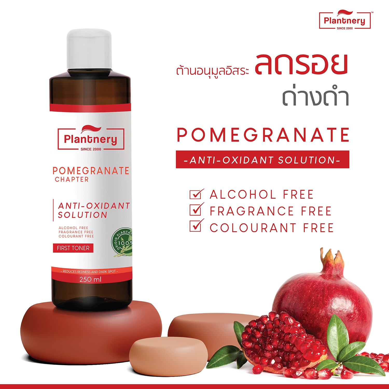 Plantnery ™ Pomegranate First Toner Help fight free radicals. Reduce hyperpigmentation and redness. Fomulate with special concentrated extract of pomegranate. Reduce hyperpigmentation and redness from acne. Has anti-inflammatory effect. Reduce dark spots on the face. Regenerates new skin cells to be soft and fresh. Increase flexibility to the skin. suitable for dark spots problem. sensitive skin. oily skin. combination skin, excess oil on face. pores skin. Natural products for sensitive skin. Free from alcohol, fragrances, preservatives, parabens, synthetic colors, silicone, SLS