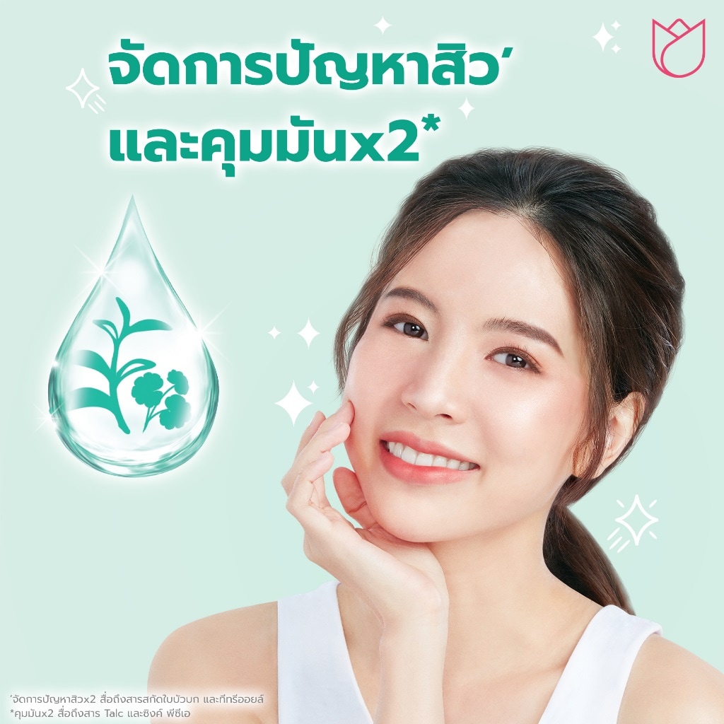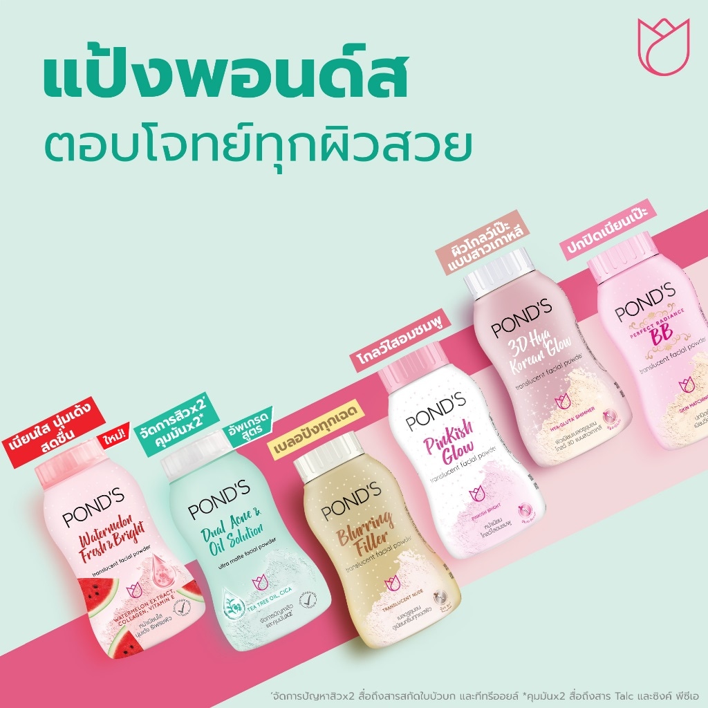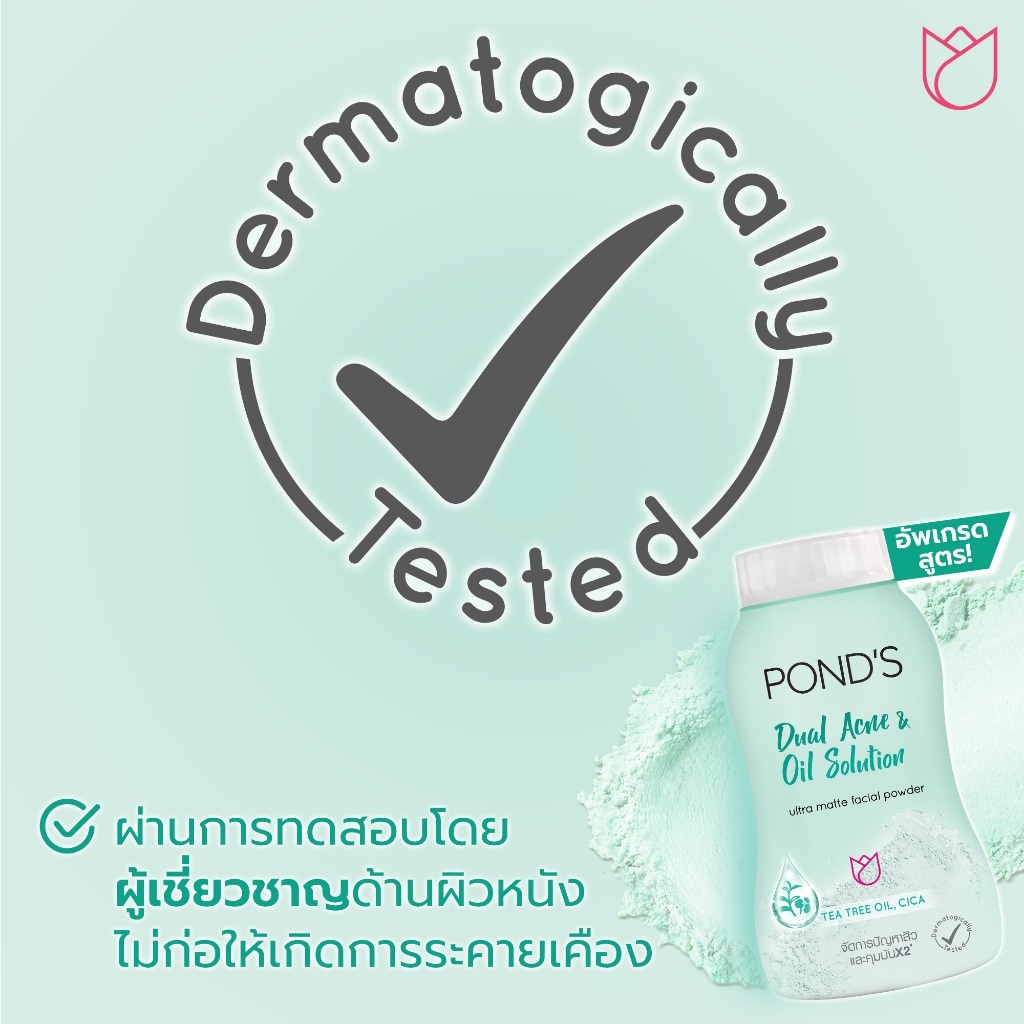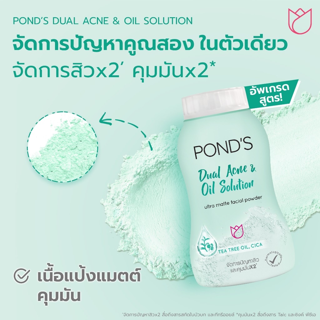 Pond'S Powder Dual Acne & Oil Solution Translucent loose powder formula to deal with acne problems and control oiliness combined with the power of tea tree oil, Centella Asiatica (Cica), Zinc, PCA, Vitamin B3 and Allantoin that help absorb excess oil on the face. Effectively deal with acne problems while helping to soothe the skin for smooth and clear skin far away from acne. Fine powder texture, light, pass the irritation test by a dermatologist, no parabens, gentle to the skin. suitable for all skin types Dealing with acne x2 , represents centella asiatica extract (Cica) and Tea Tree Oil, oil control x2 represents Talc and Sync PCA. of Pond's powder New Acne Talcum - Dual and Double solution - Anti Acne X2 - Oil control X2 - Tea Tree Oil, Cica, Zinc PCA - Dermatologically tested - Winning concept