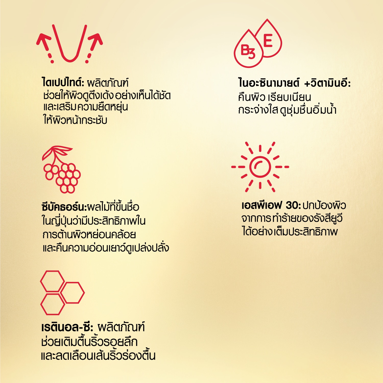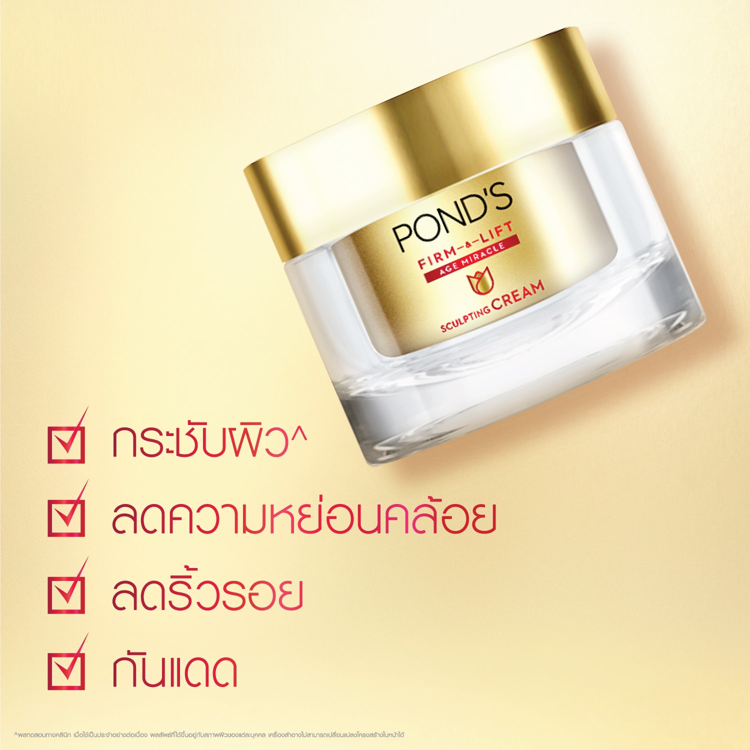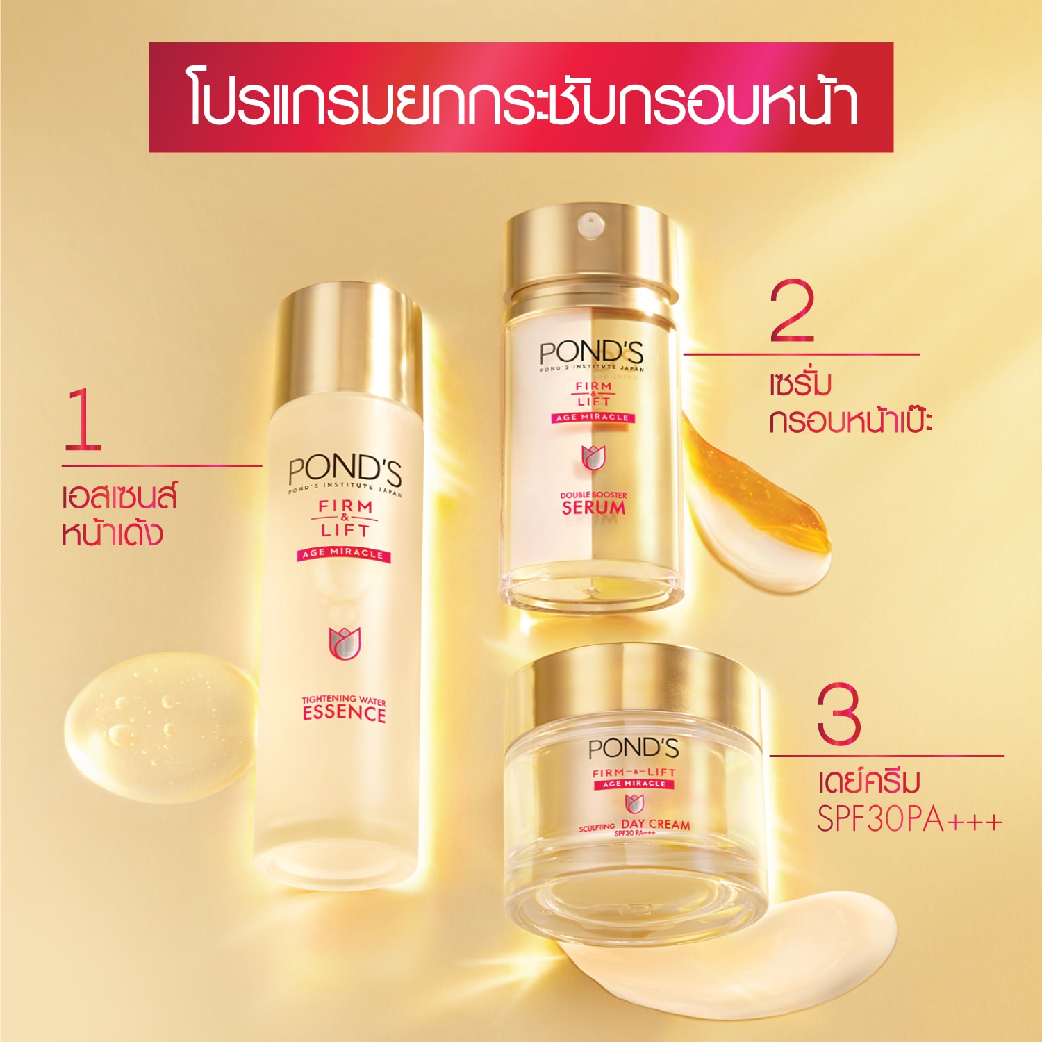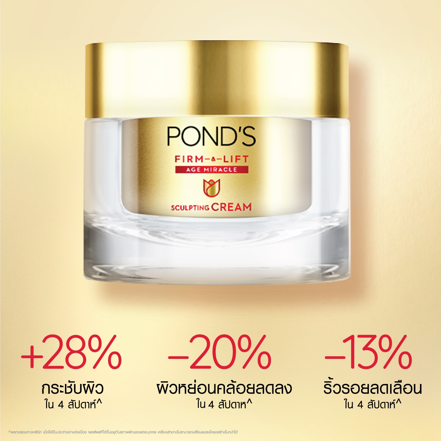 POND'S FIRM & LIFT AGE MIRACLE SCULPTING DAY CREAM SPF30 PA+++ BREAKTHROUGH RAPID-LIFT TECHNOLOGY Inspired by cutting edge Thread Lifting & Japan’s advanced anti-aging technologies, Pond’s Institute Japan introduces the latest breakthrough innovation - our first ever Firm & Lift range that redefines your facial lines. Get Lift, supple & radiant skin in 4 weeks - Dipeptide Helps to visibly firm, uplift & boost elasticity for lifted skin - Sea Buckthorn Known as longevity fruit in Japan to rejuvenate & prevent sagging - Retinol-C Helps to plump deep wrinkles and smoothen fine lines - Niacinamide + Vit E Brightens, smoothens and moisturises skin - SPF30 Strong sun protection against skin damage caused by UV rays